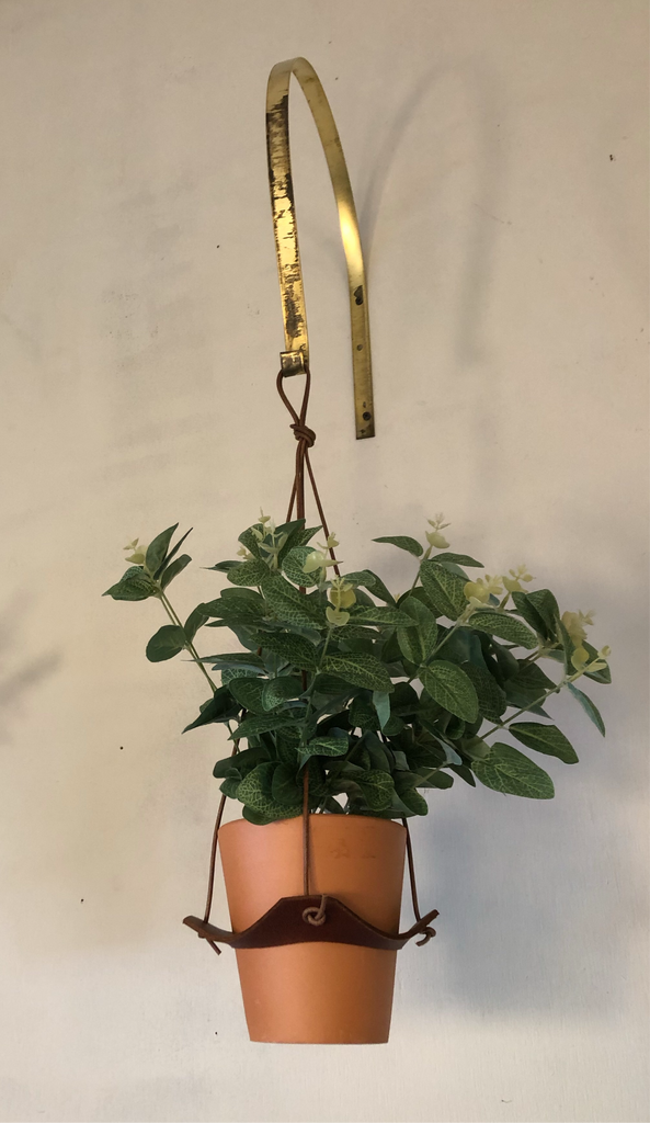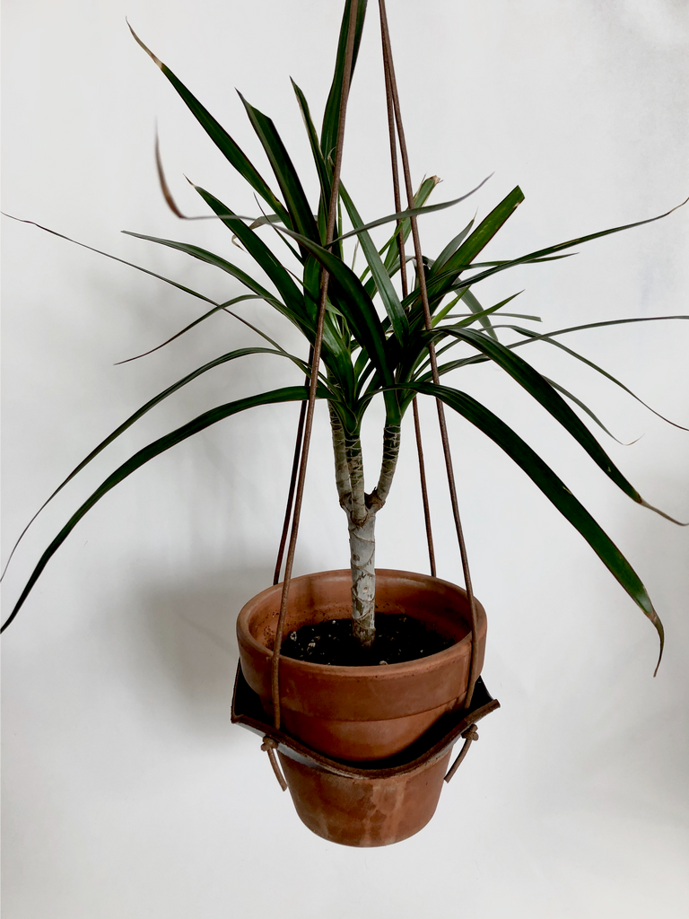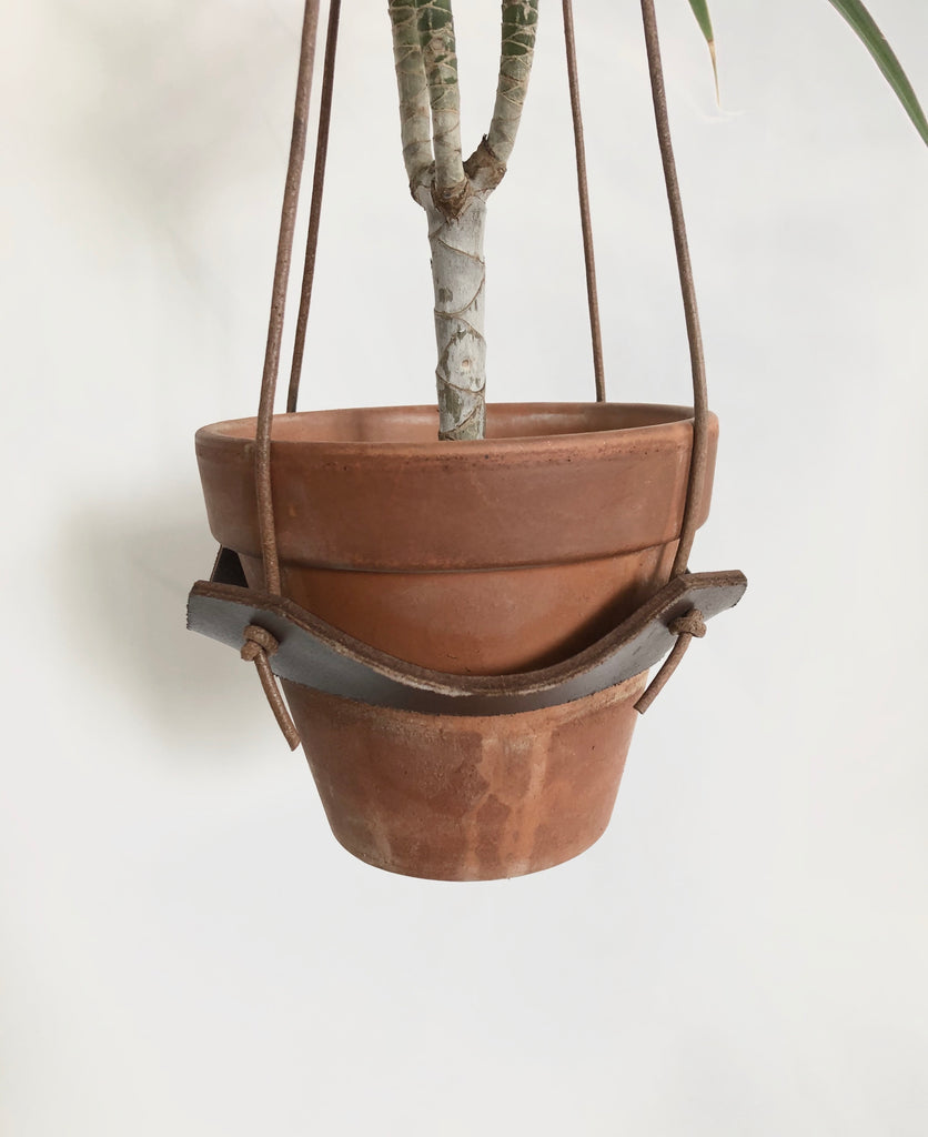 A small leather hanging pot holder. Fits pot 4-6” in diameter.