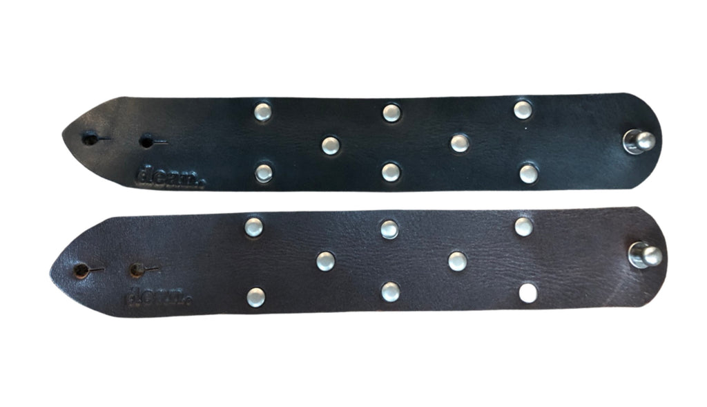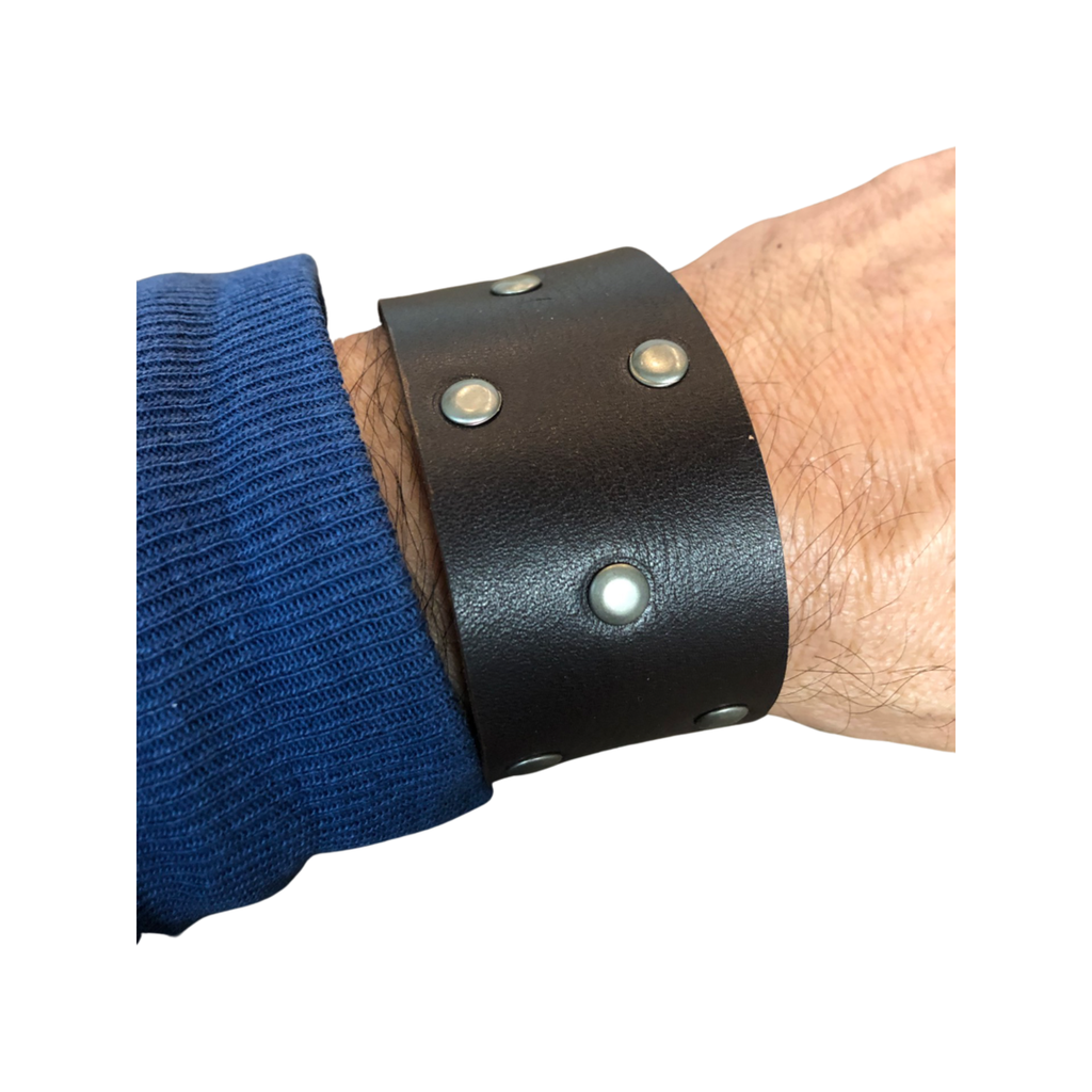 An 1.5” wide cuff with 1/4” pewter studs and a ball-post closure