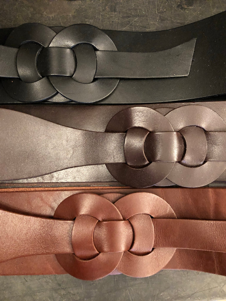 A wide wrap belt with a 3 ring leather closure. Fits size 28-34", adjustable. 3" wide w/steel button closure