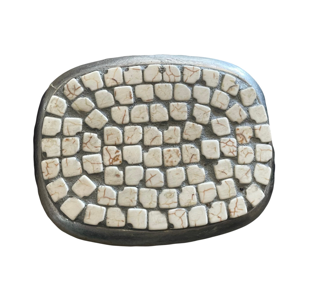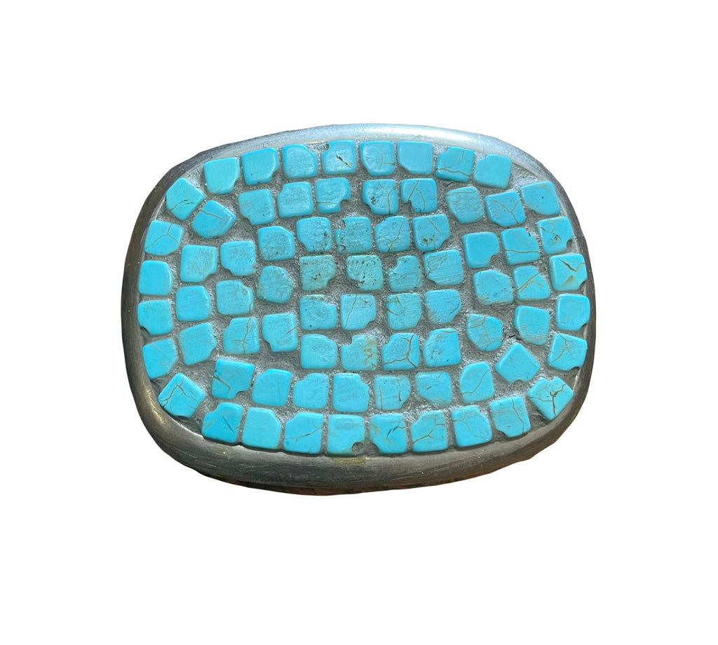 Oval inlayed turquoise buckle with our 1.5” belt strap. Each buckle is 3.25x2.25 pewter base and inlayed with white or blue turquoise.