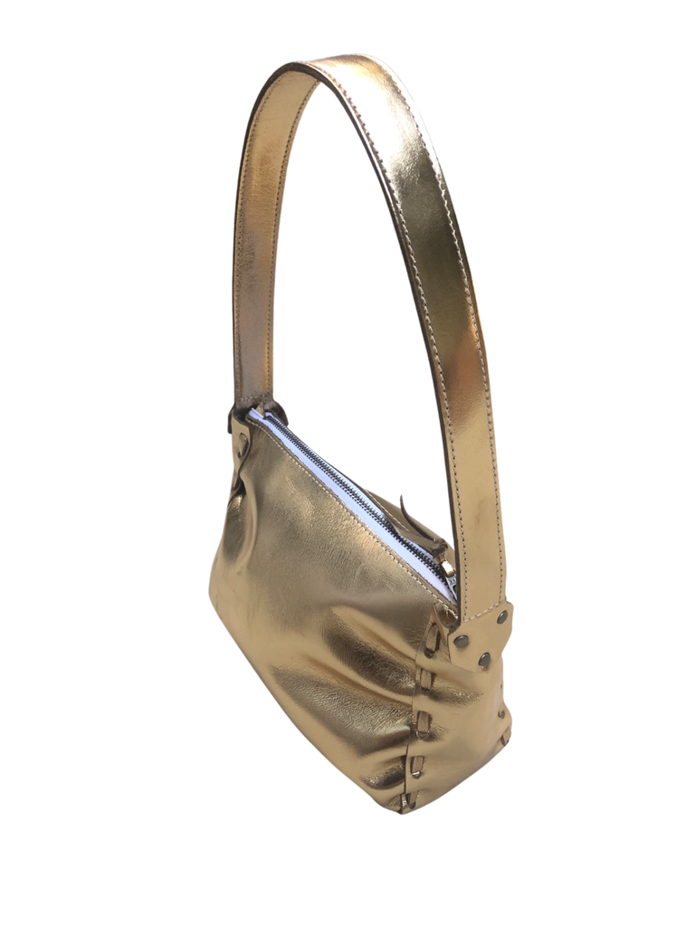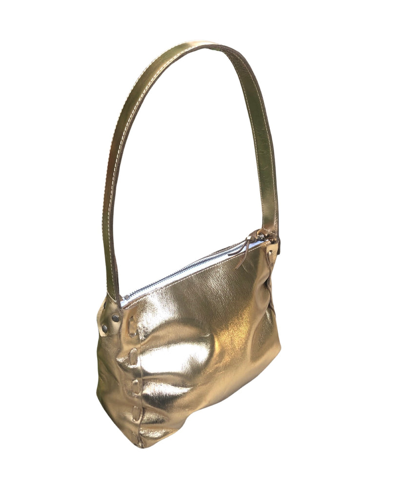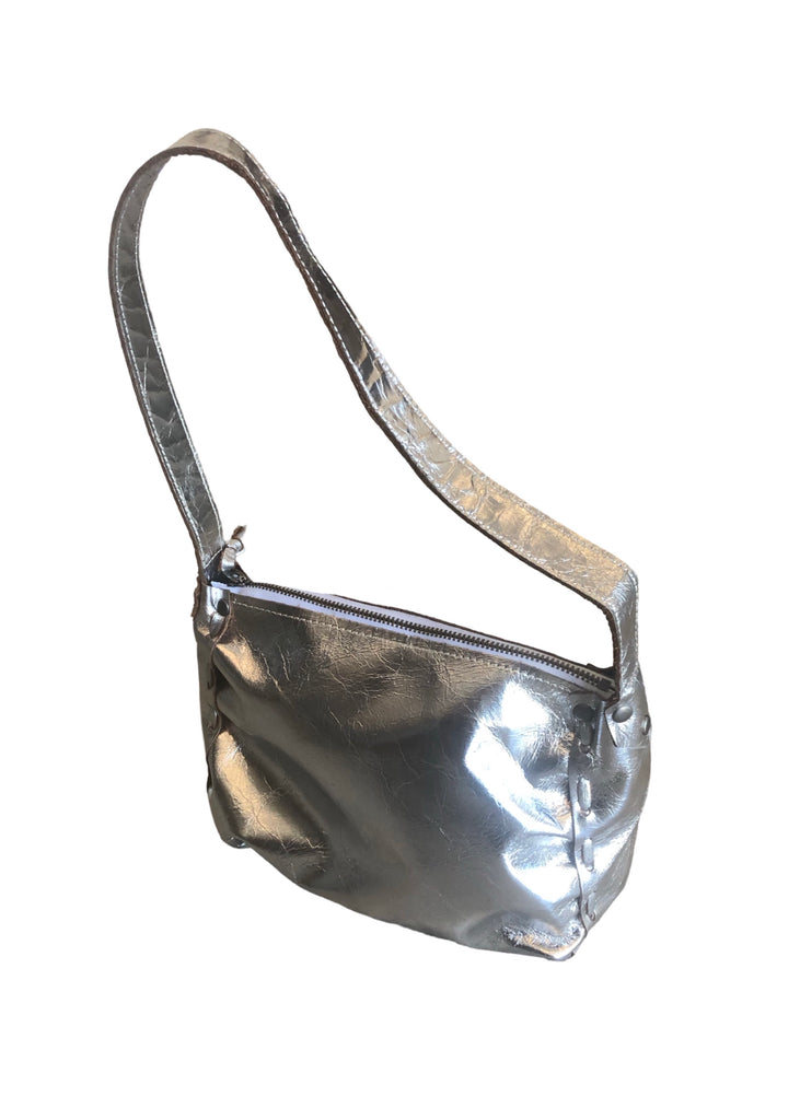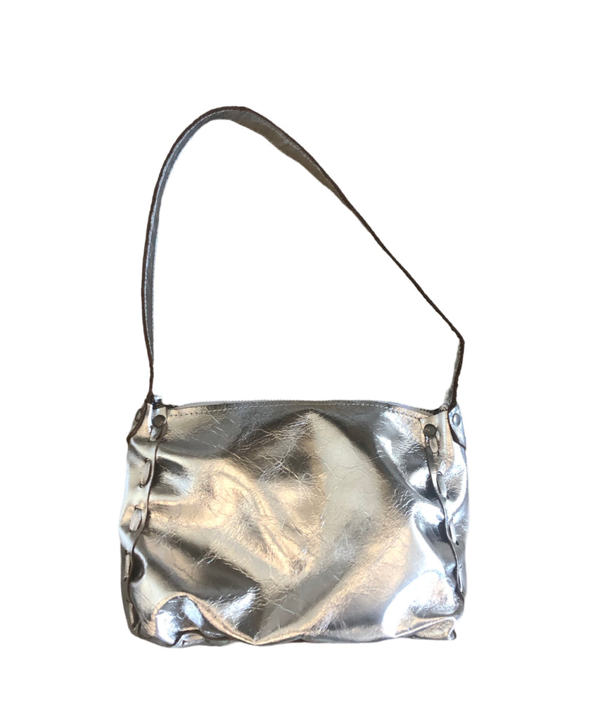 A hand-laced shimmery shoulder bag with a top zipper and fixed shoulder strap. Made in USA from Italian ‘foiled’ leather.