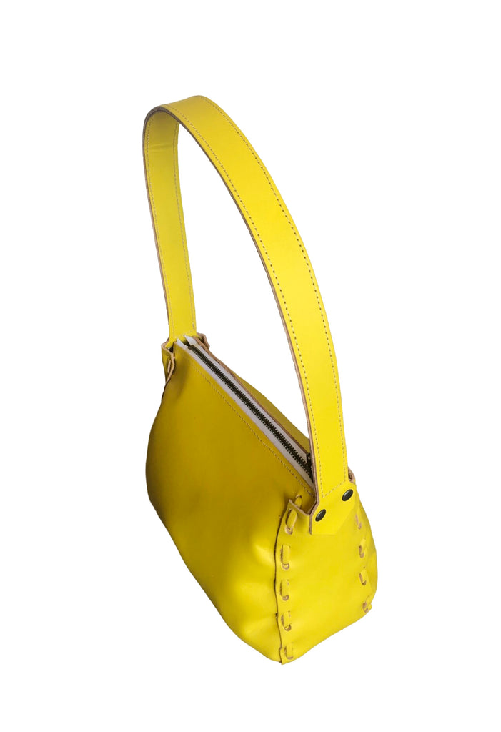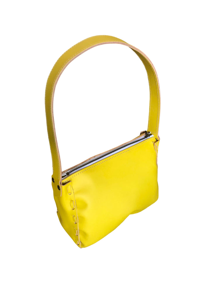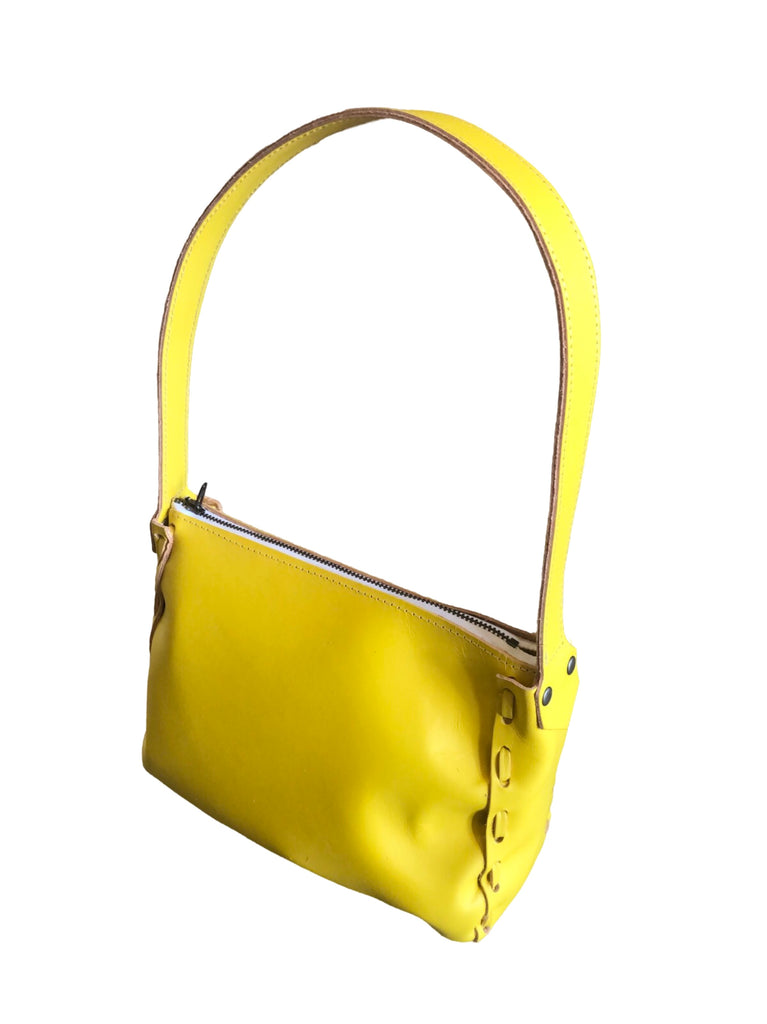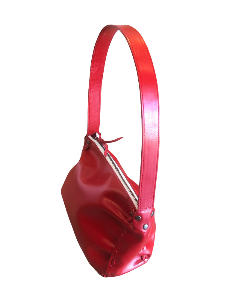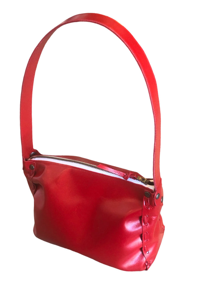 A hand-laced shimmery shoulder bag with a top zipper and fixed shoulder strap. Made in USA from Italian ‘foiled’ leather.