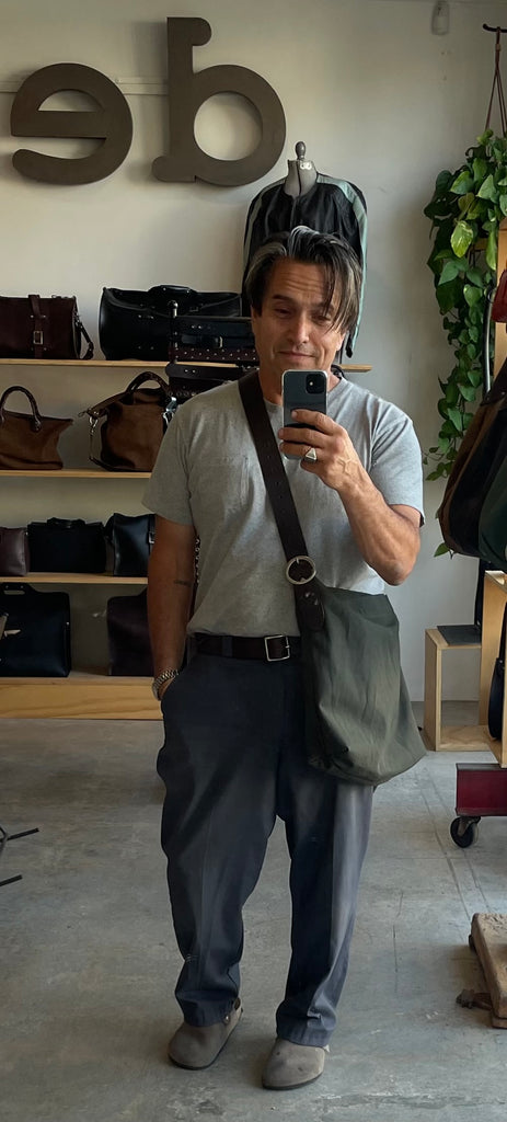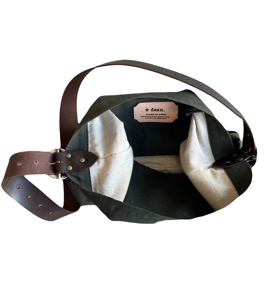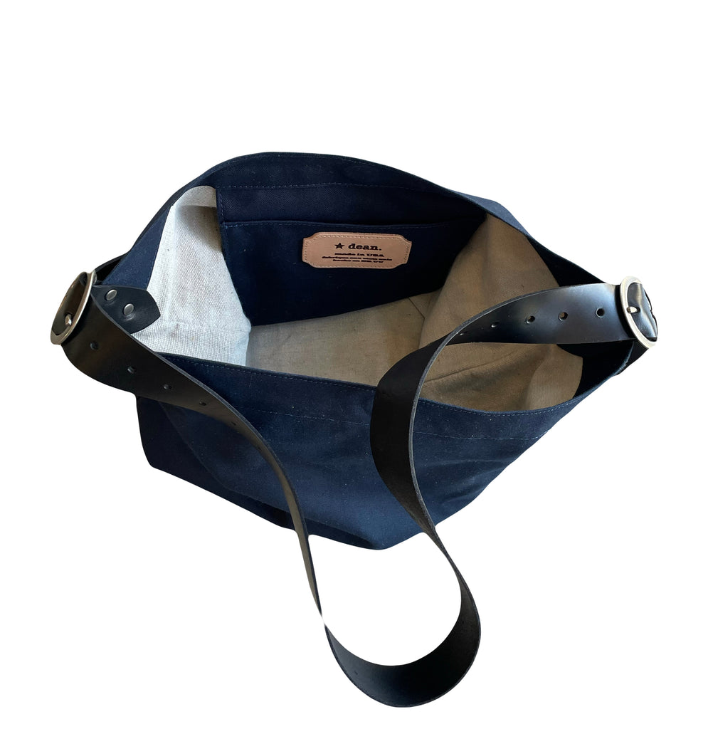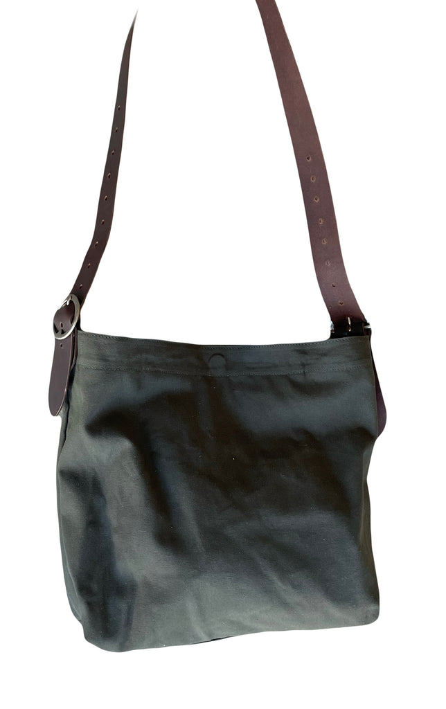 A wide strapped two buckle bucket bag with two large interior pockets and a magnetic closure. In canvas with canvas lining.