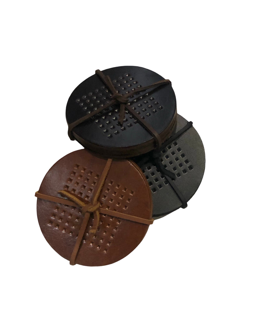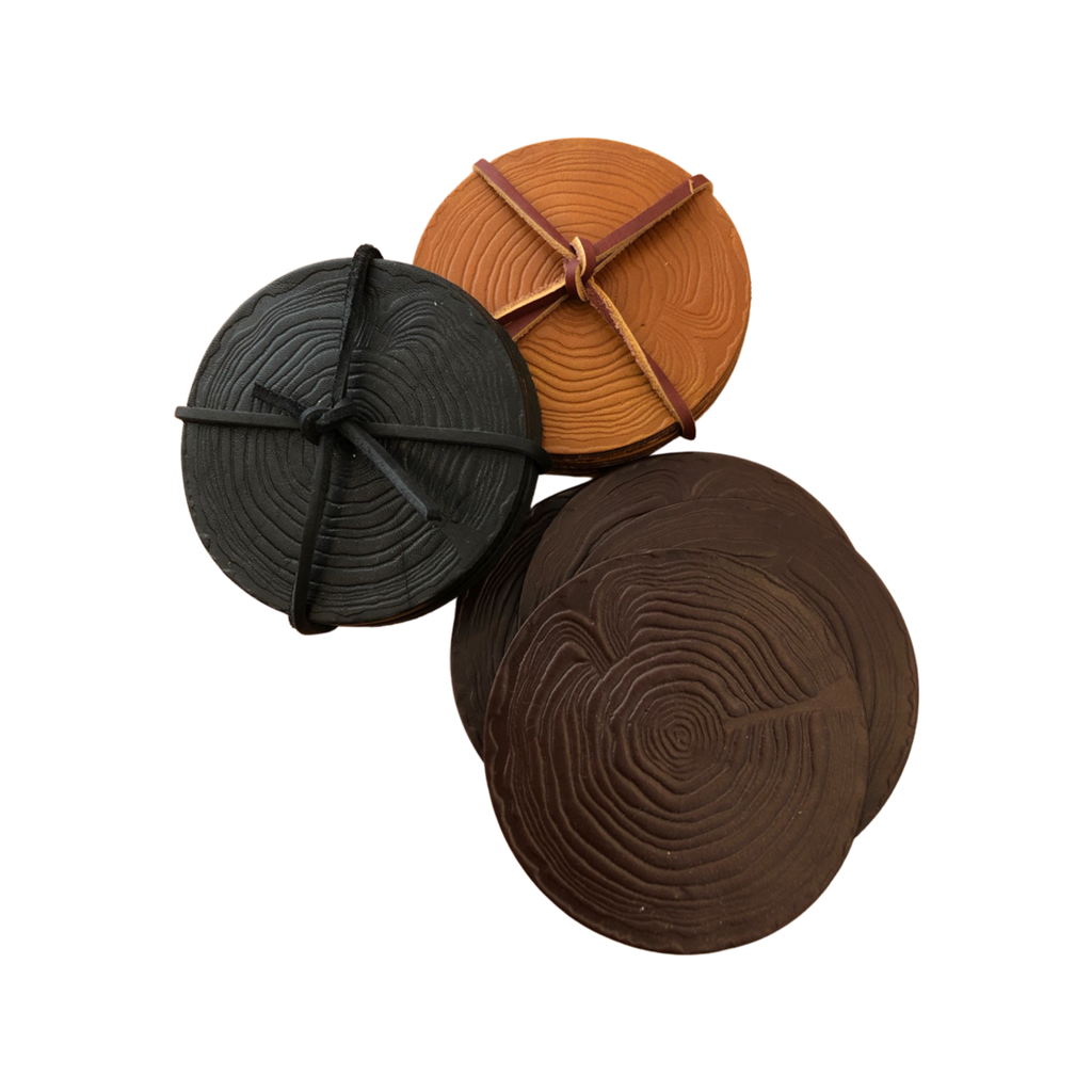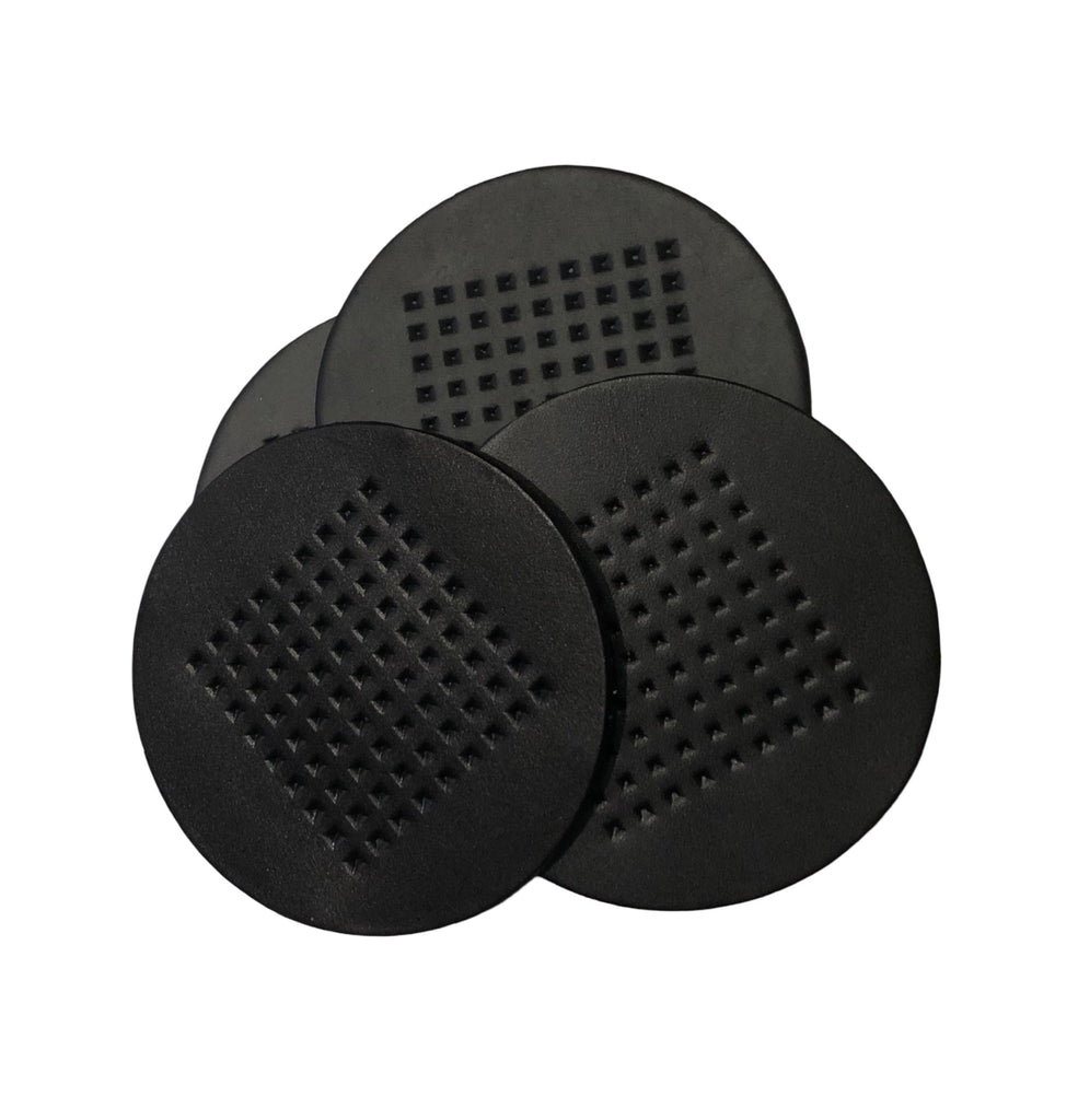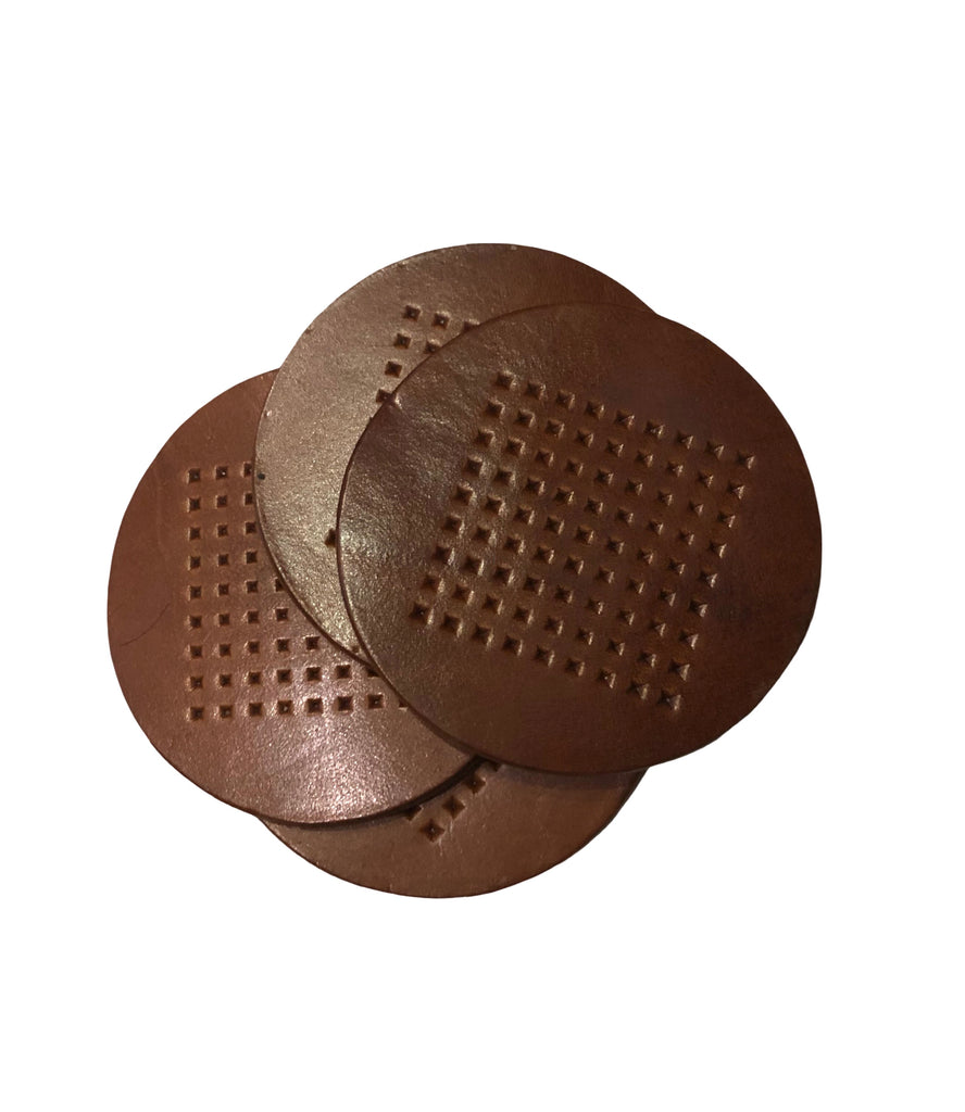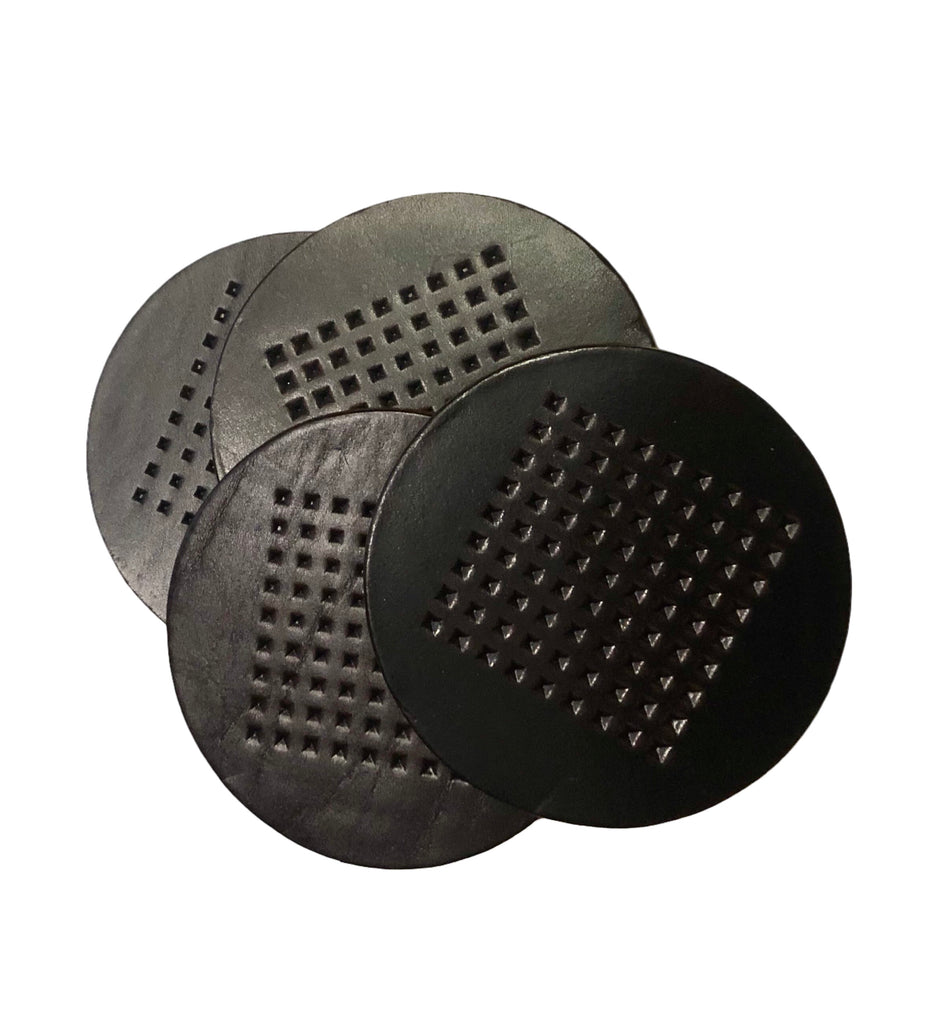 Embossed coasters made from heavy latigo leather. Embossed in wood grain or inverted pyramid pattern.