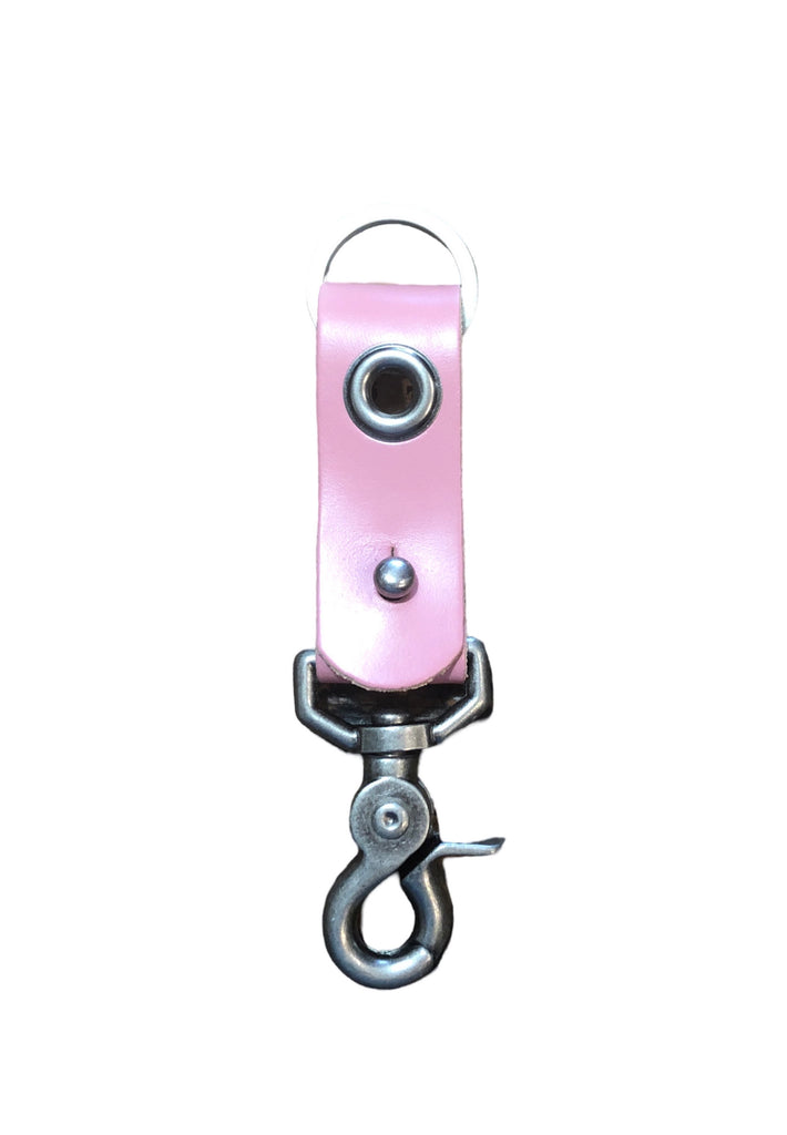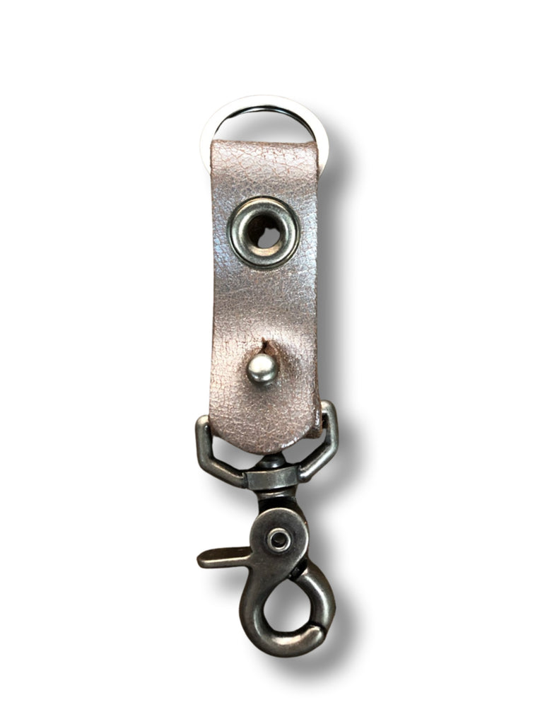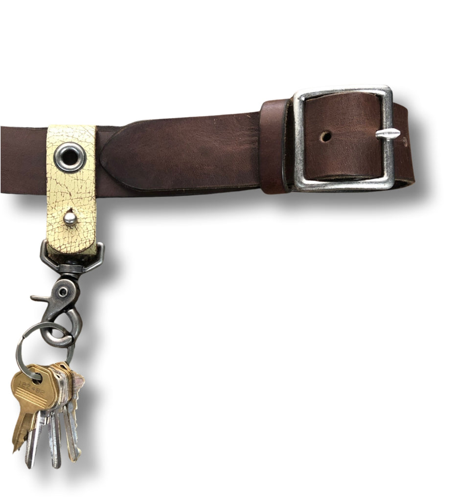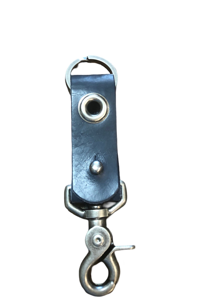 1” wide leather band with 5/8” grommet and pewter clip and key ring.