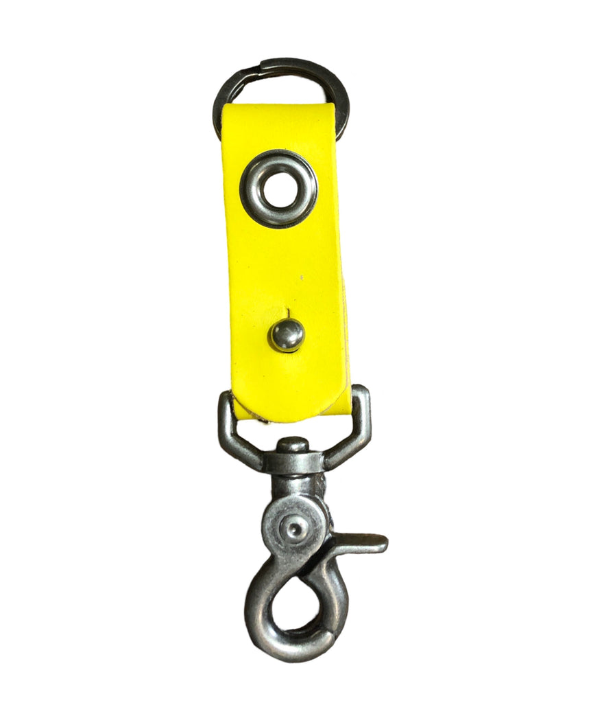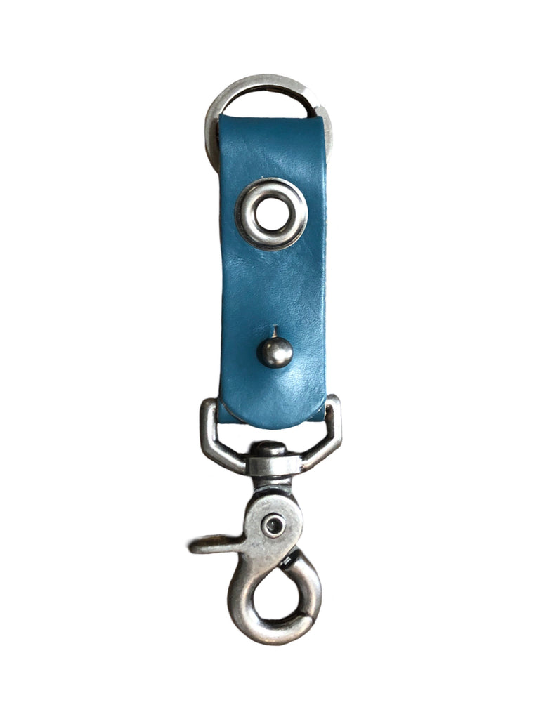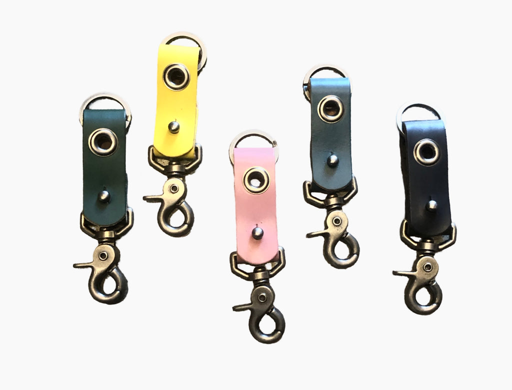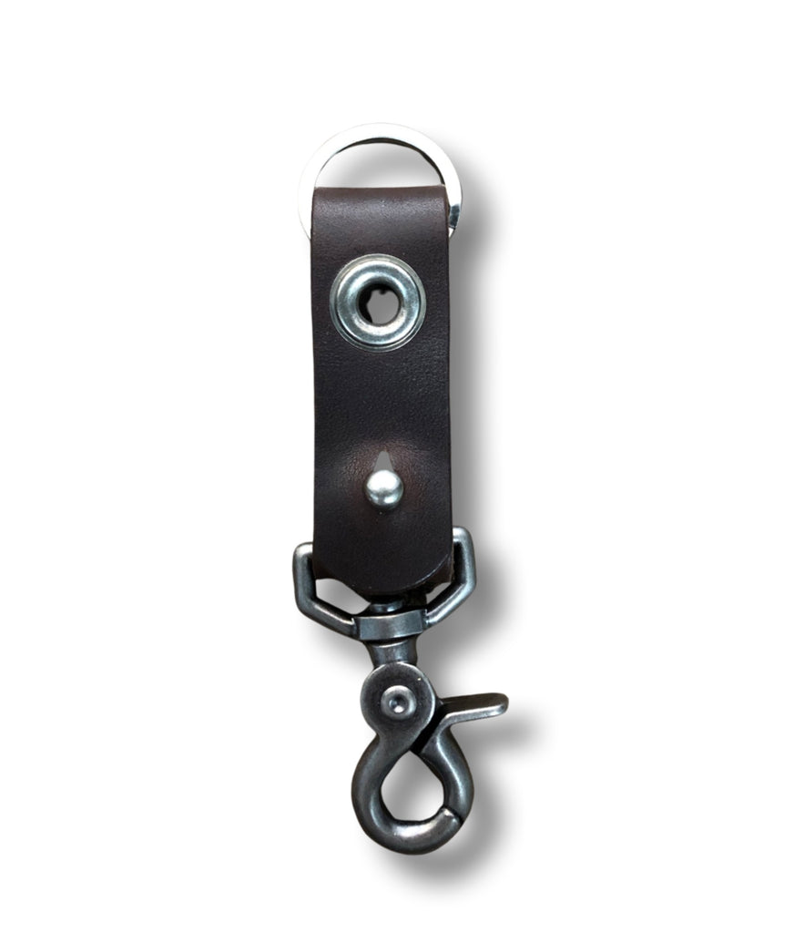1” wide leather band with 5/8” grommet and pewter clip and key ring.