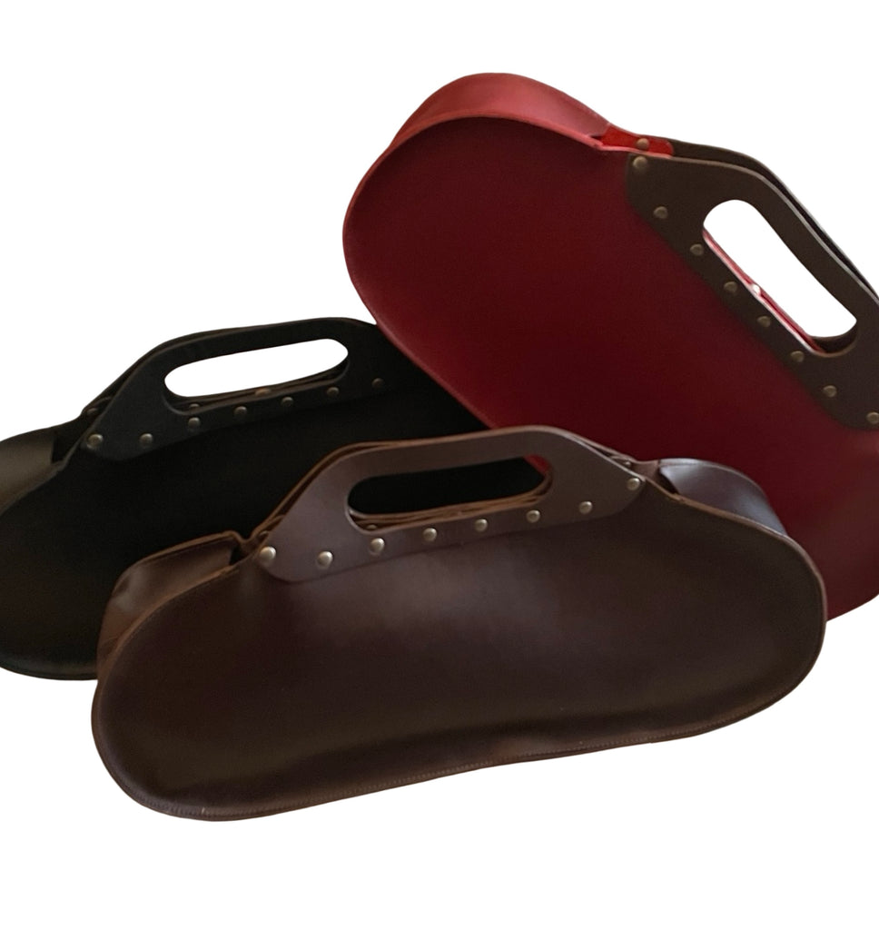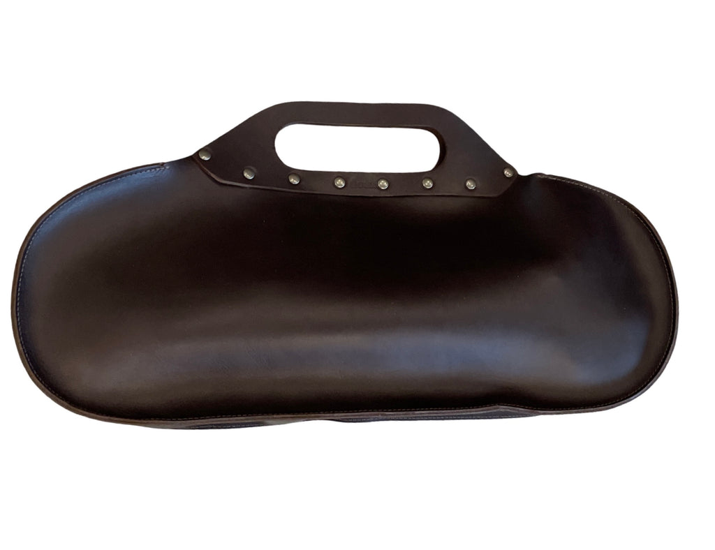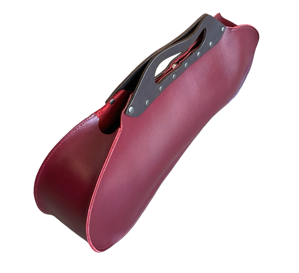 Oblong clutch with a heavy latigo handle and magnetic snap closure.
