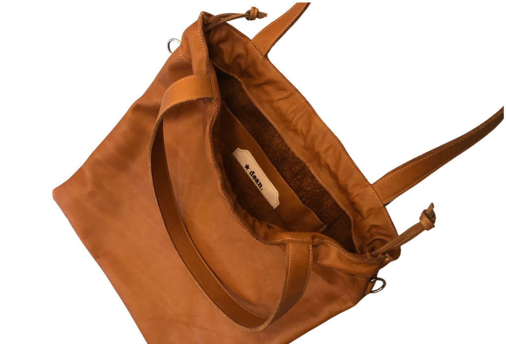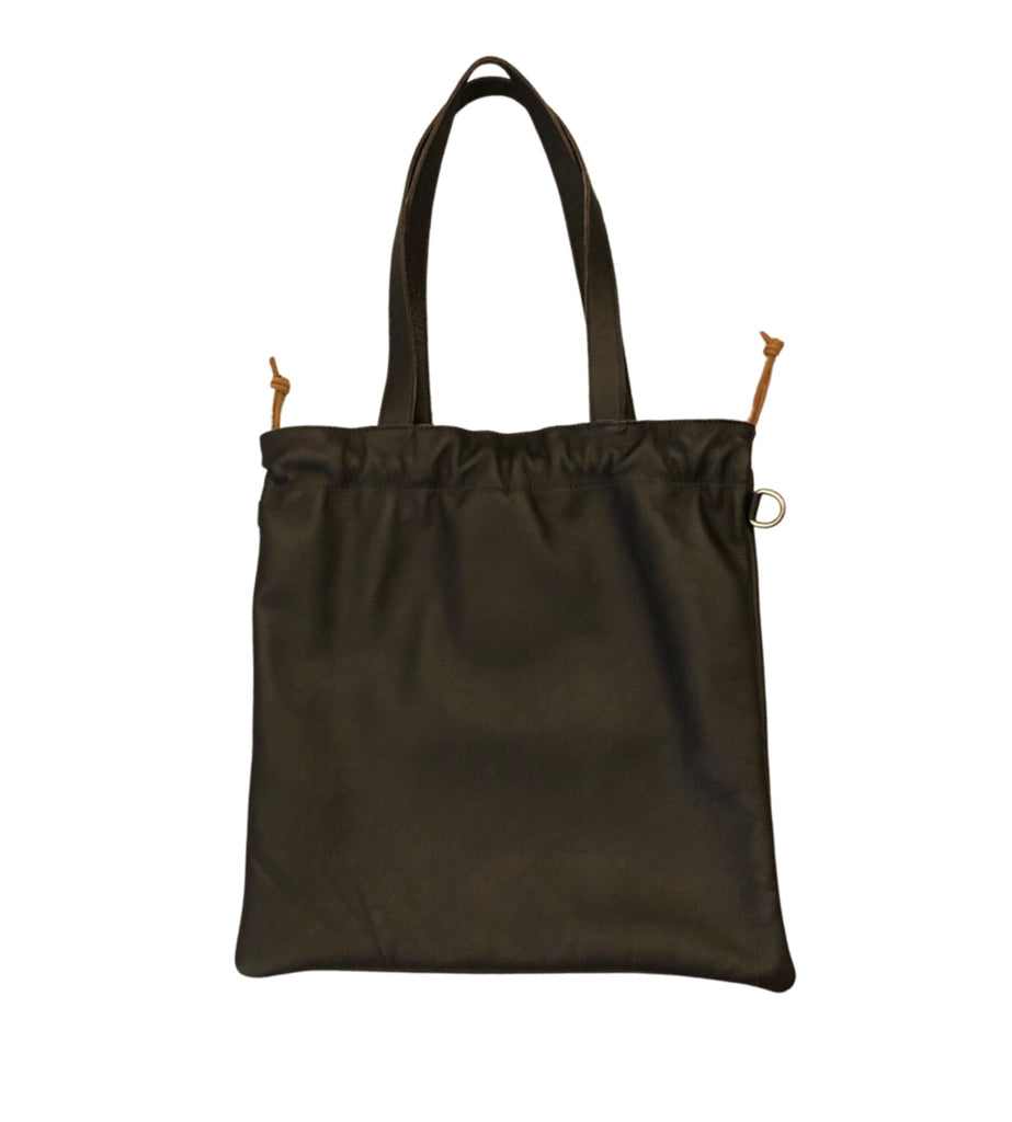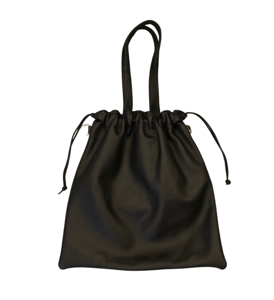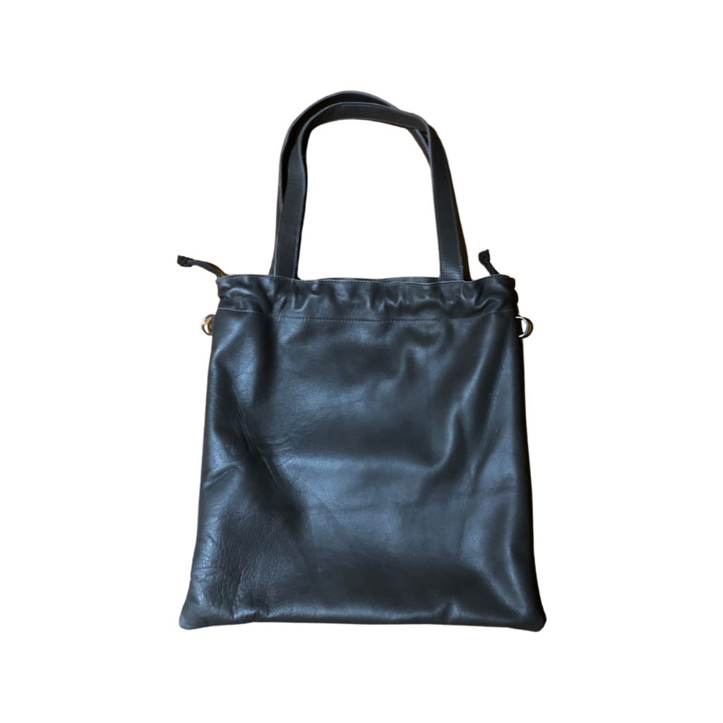 A flat tote with a drawstring closure and interior pocket. Comes with a crossbody strap