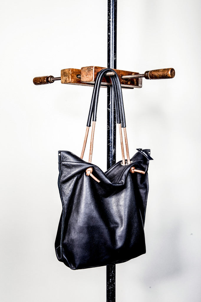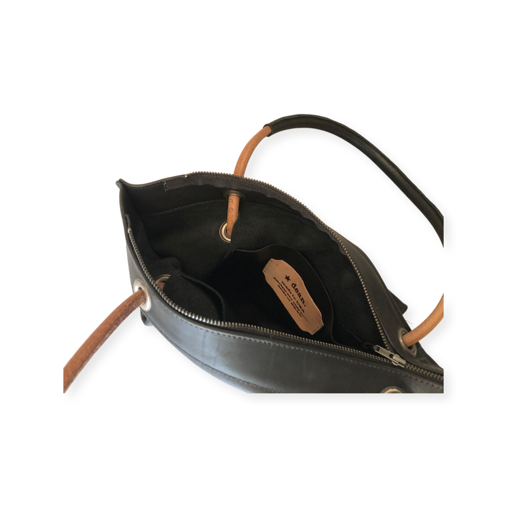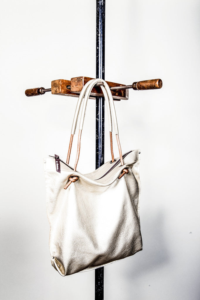 Medium tote with zipper closure, two interior pockets and unique pleating. Handle is made with a natural 8mm veg-tanned belting.