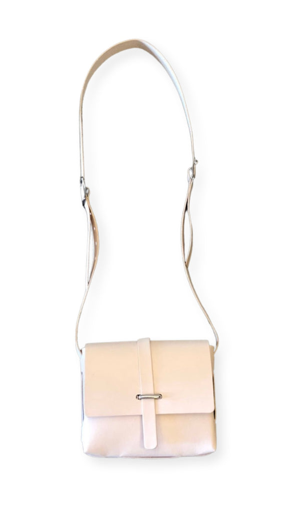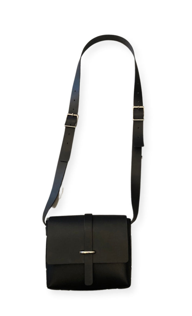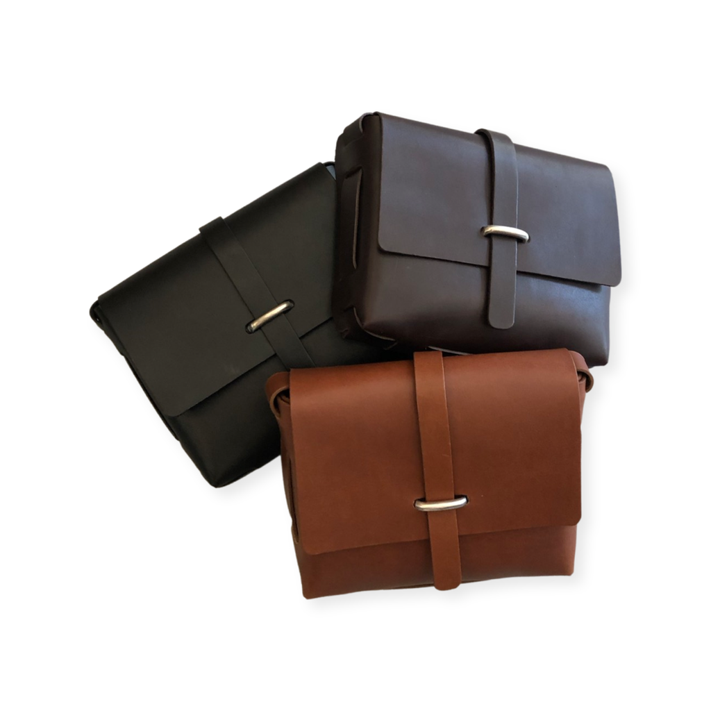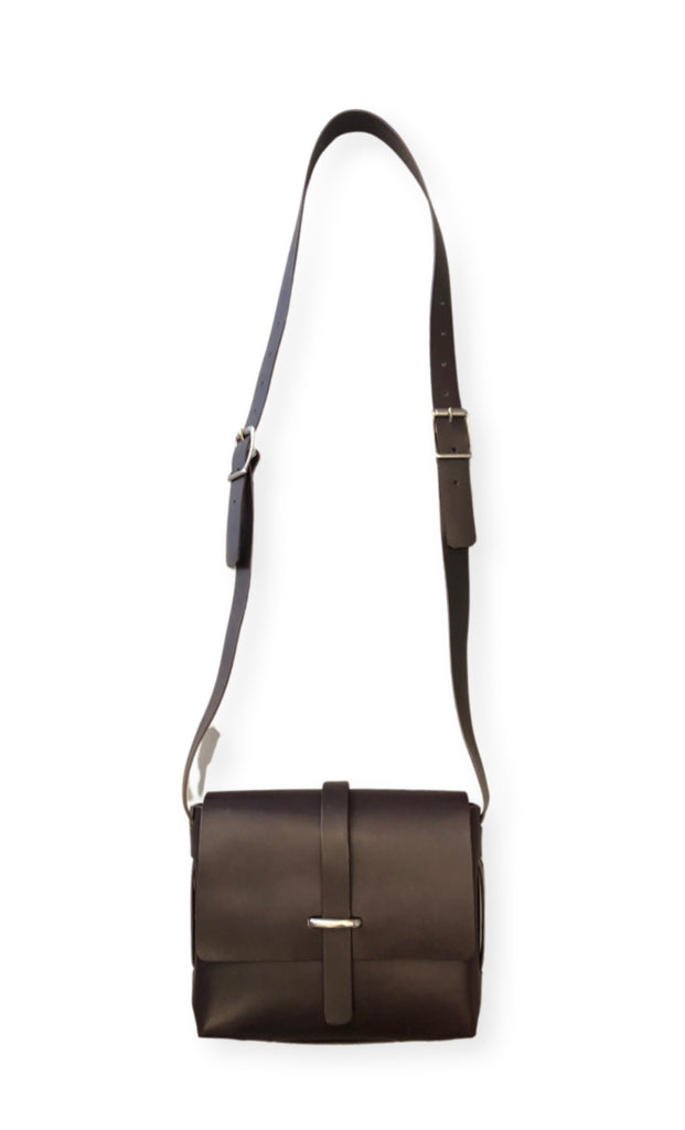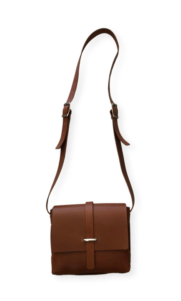 A small crossbody bag with steel loop closure and adjustable two buckle strap.
