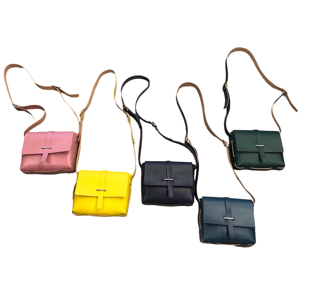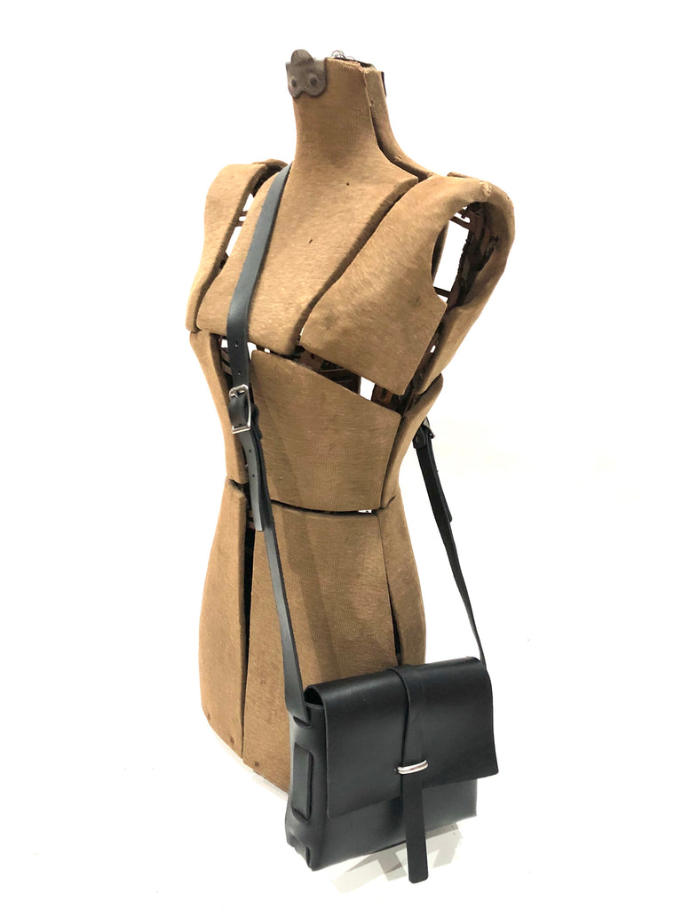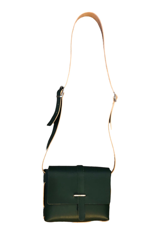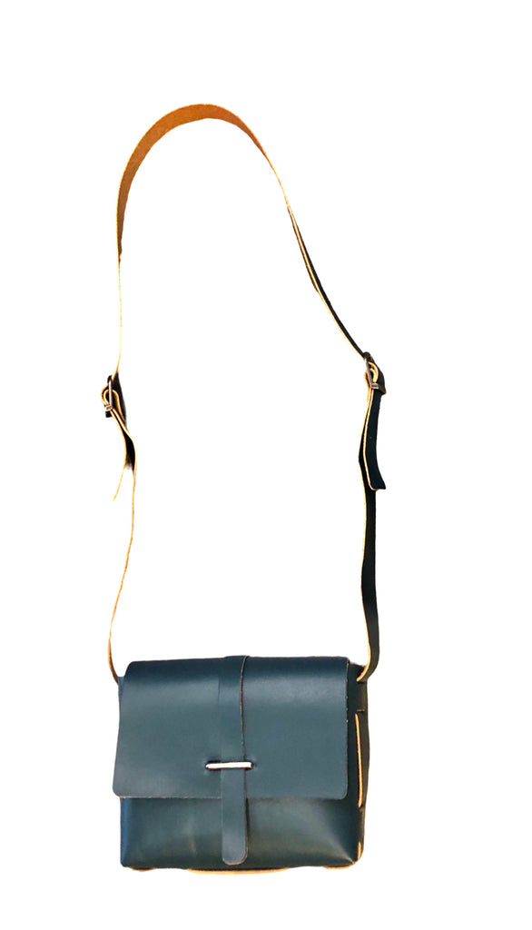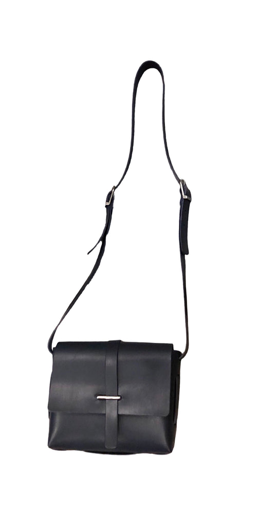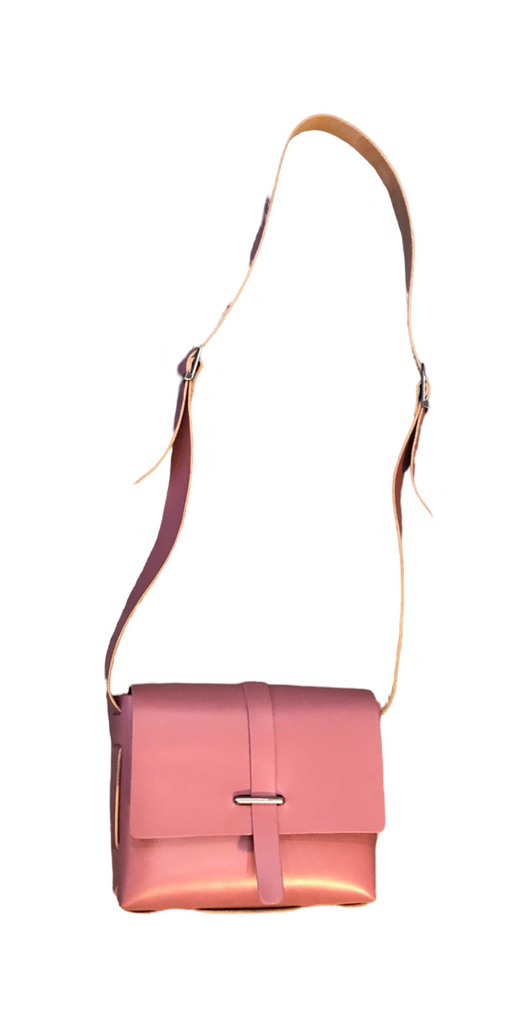 A small crossbody bag with steel loop closure and adjustable two buckle strap.