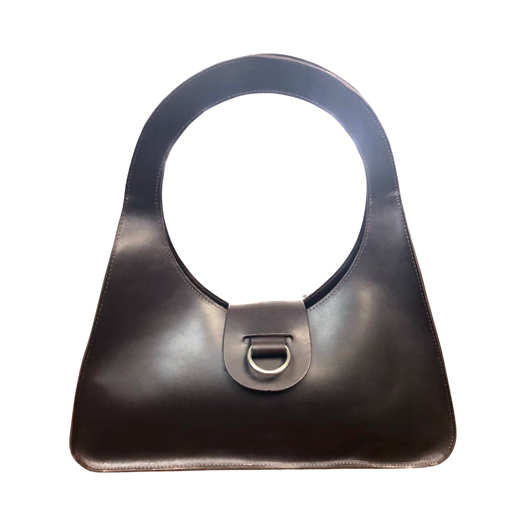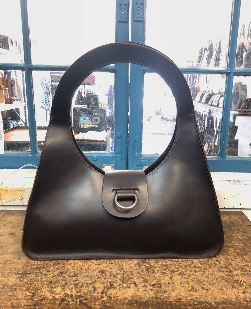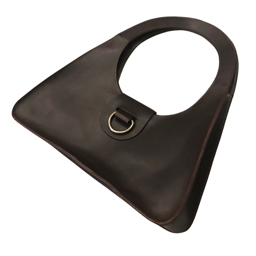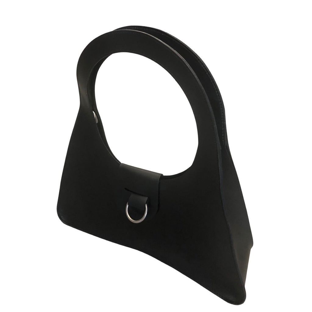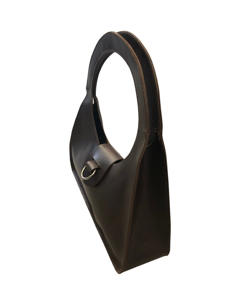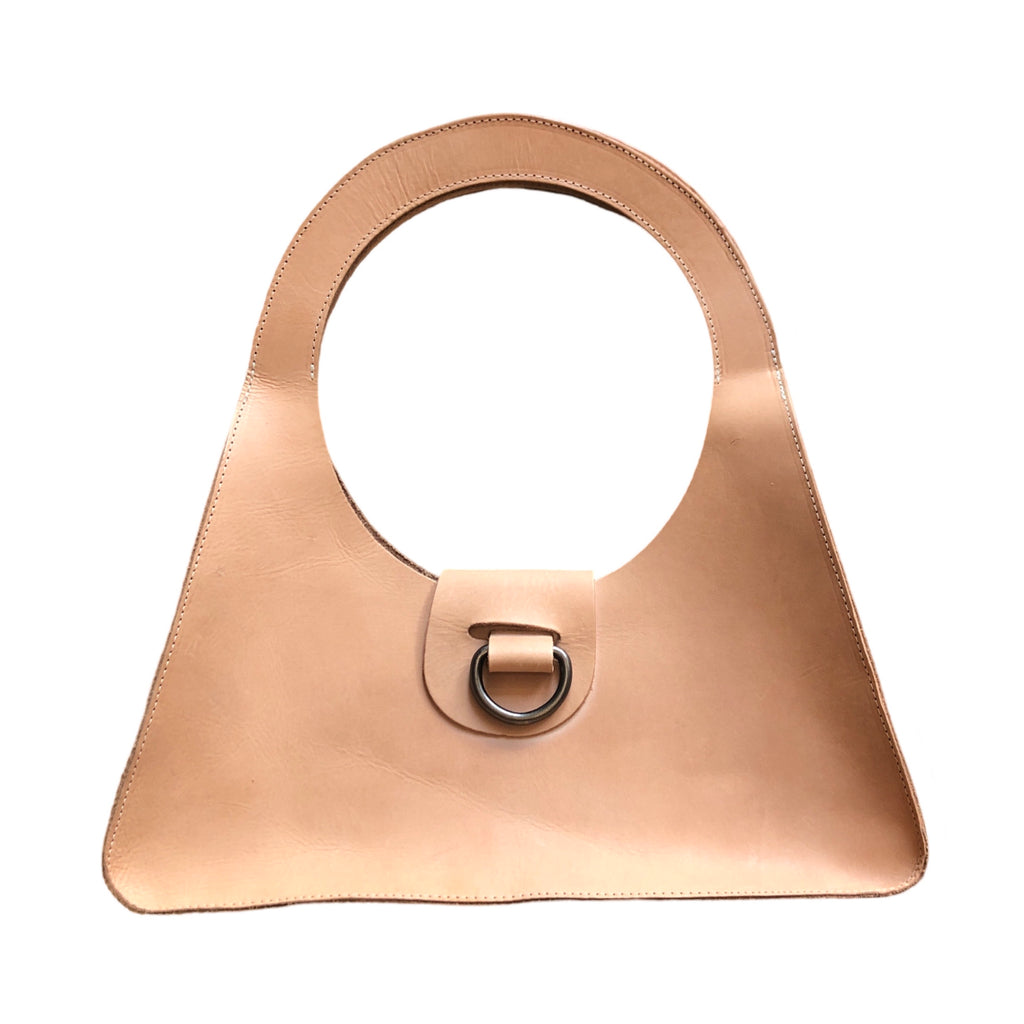 A timeless triangular shoulder bag with a perfect 8” circular handle. Made with a semi rigid 4oz latigo leather for lasting durability and beauty. Small flap closure with 1.5” pewter ring.