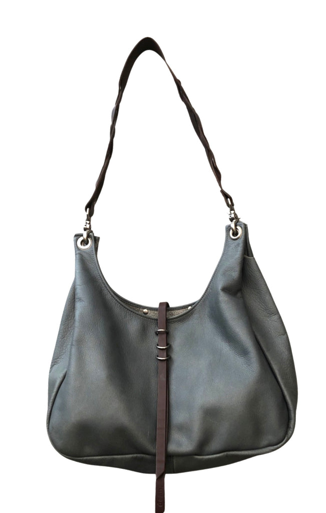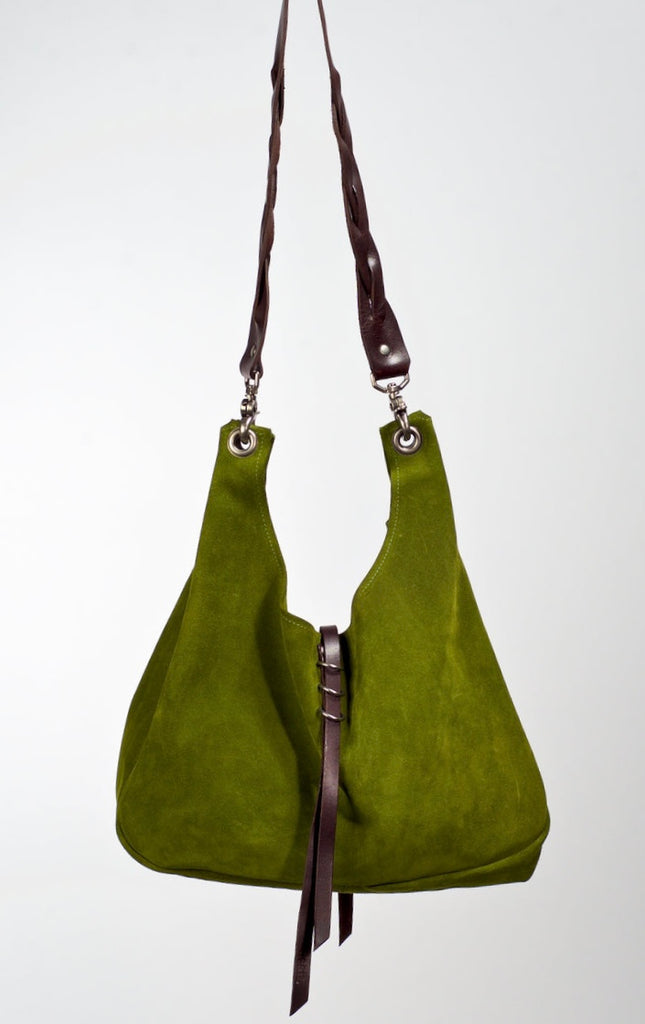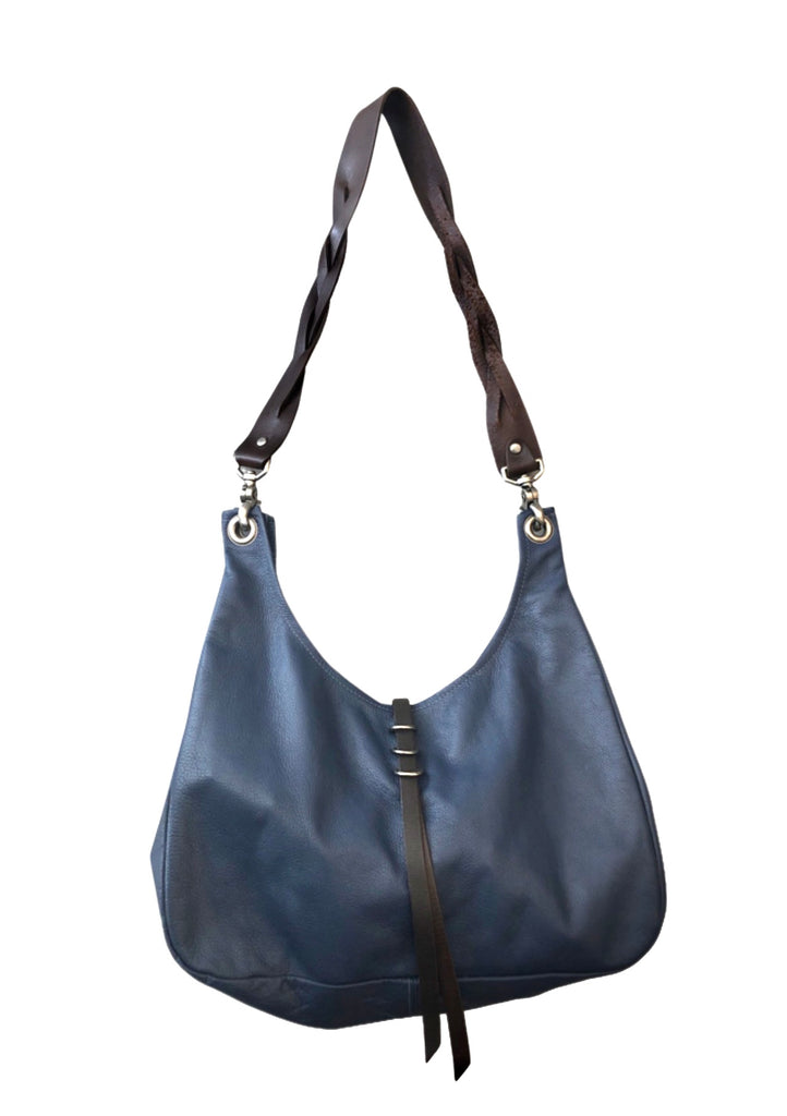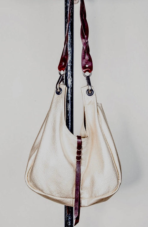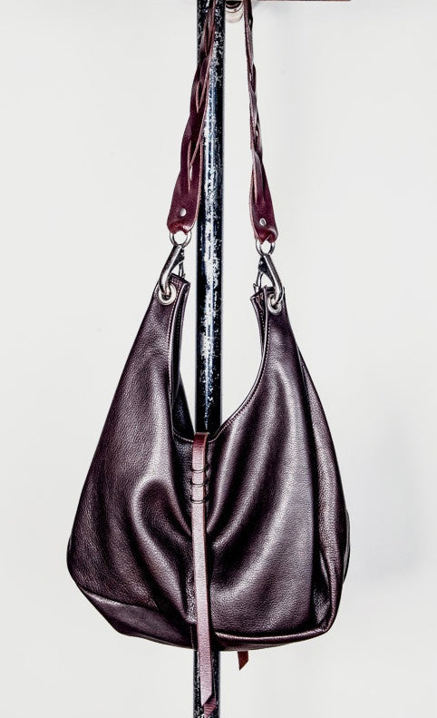 A medium sized shoulder bag with braided strap and d ring closure. Interior pocket.