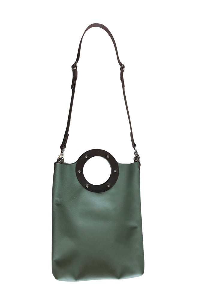 Circular handle is 6" w/detachable shoulder strap & small interior pocket