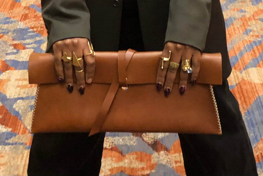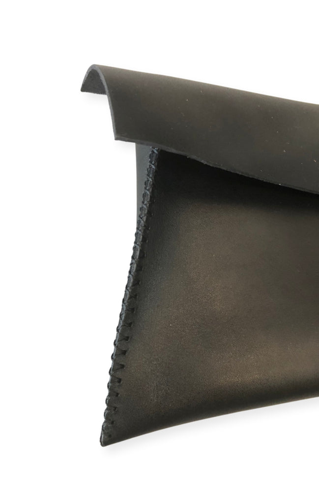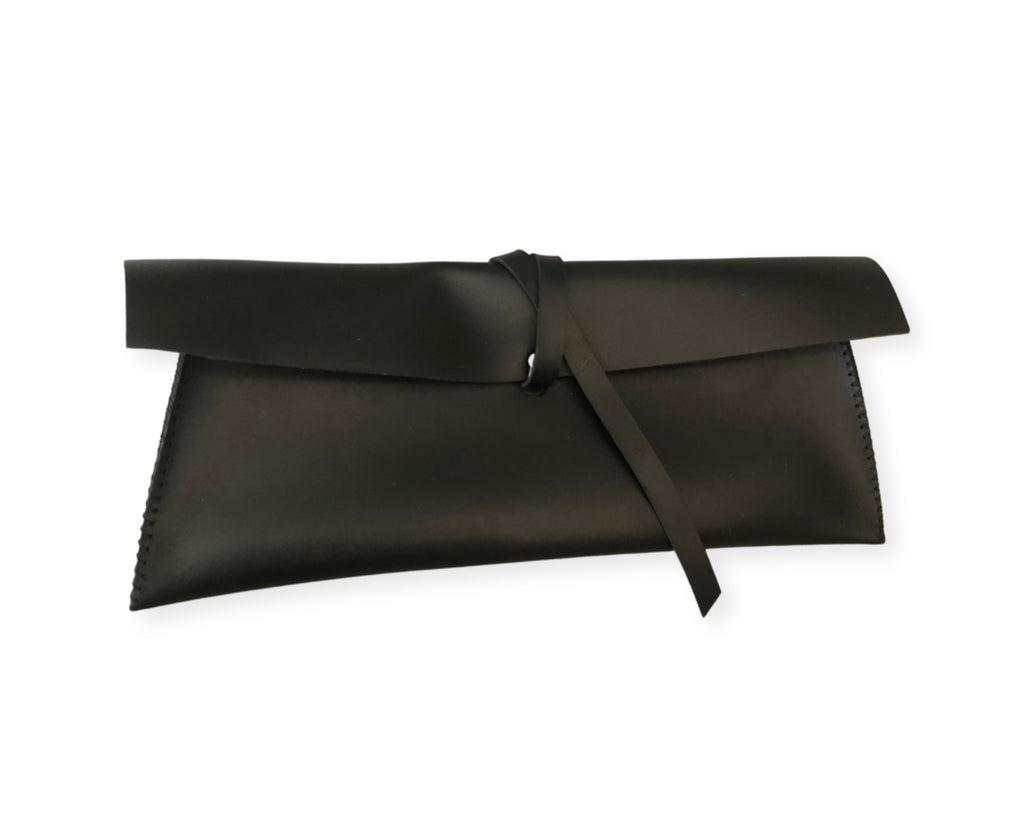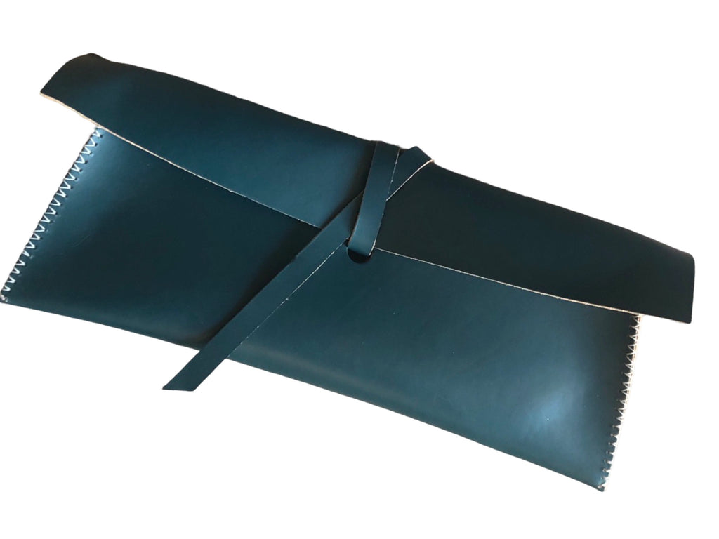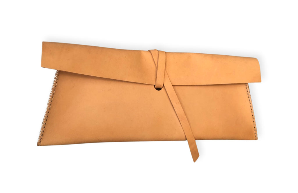 Clutch with wrap around closure. One piece of leather, hand stitched