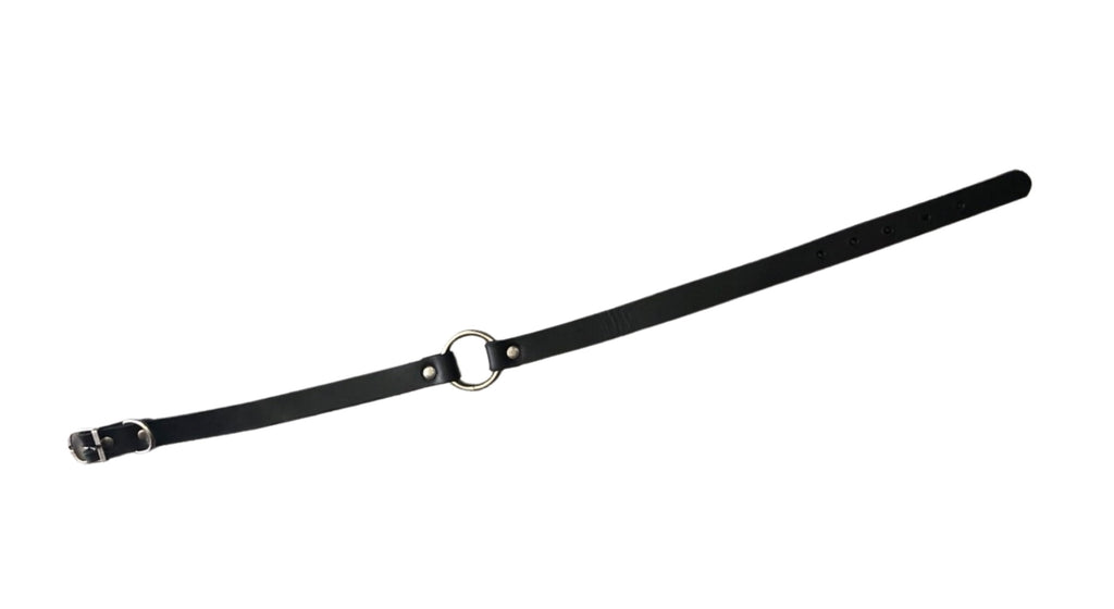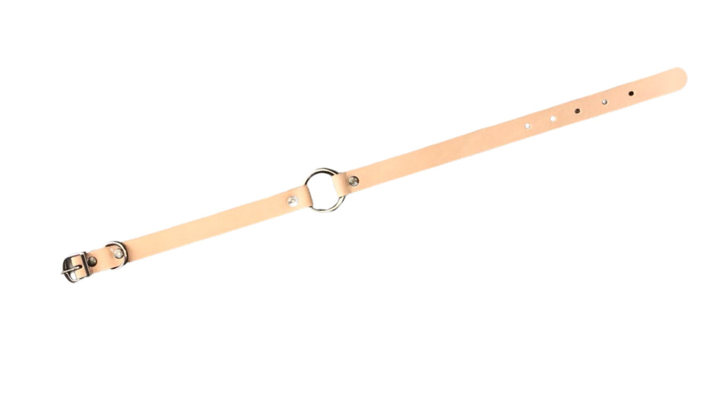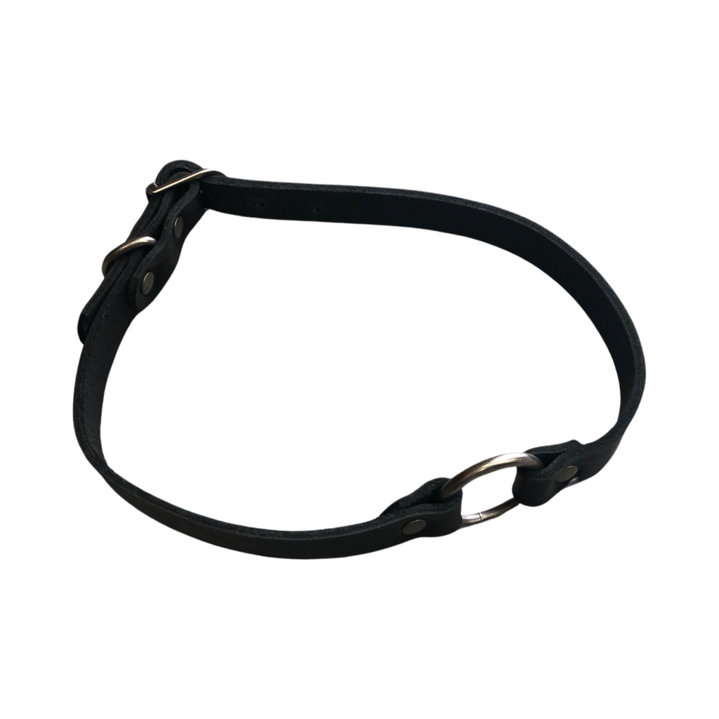 A thin (3/4”) latigo leather collar w/ 1.25” d ring center.