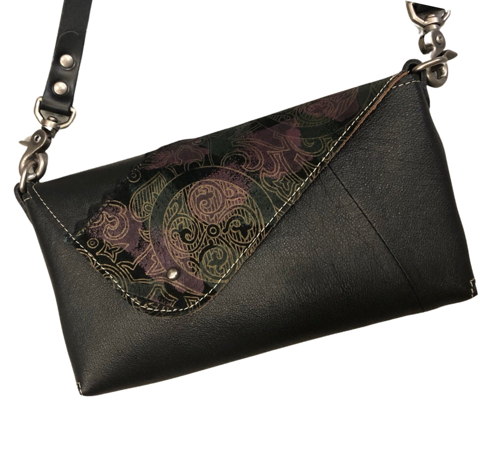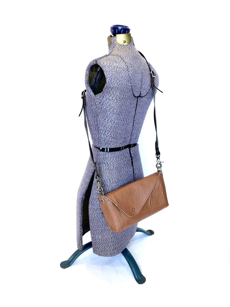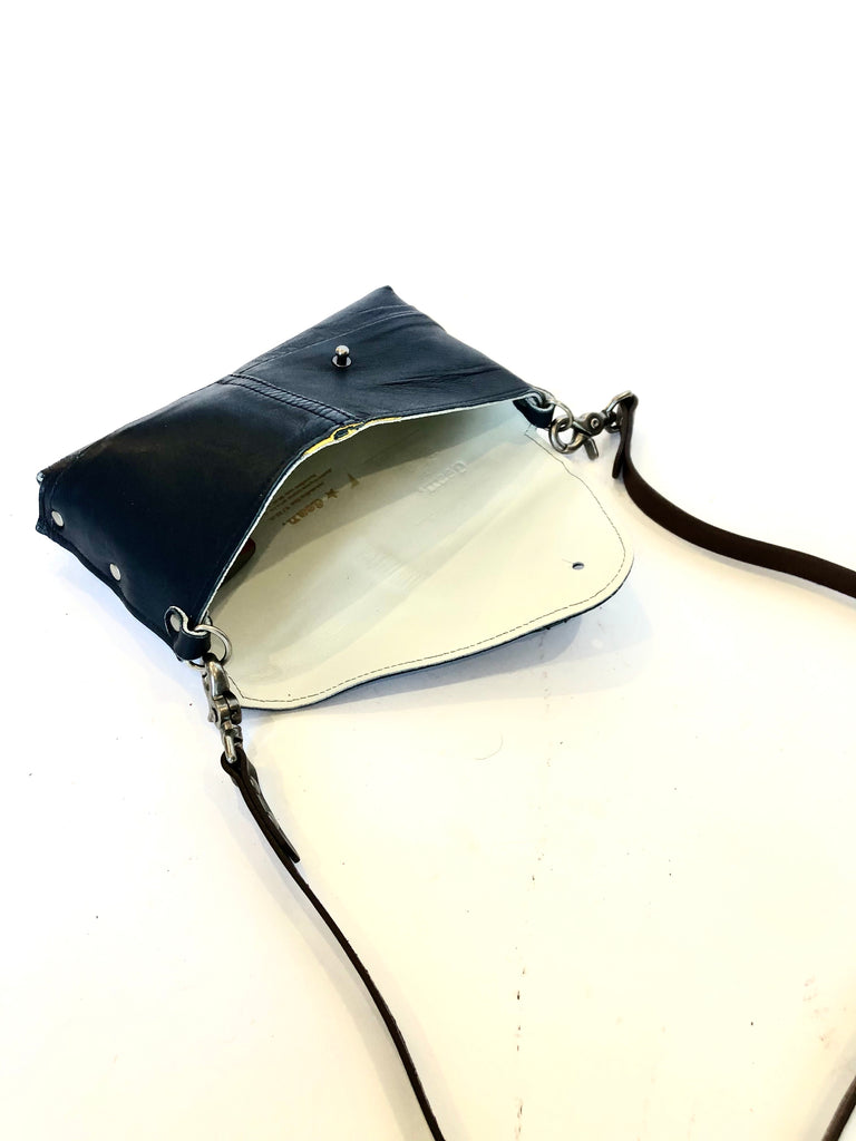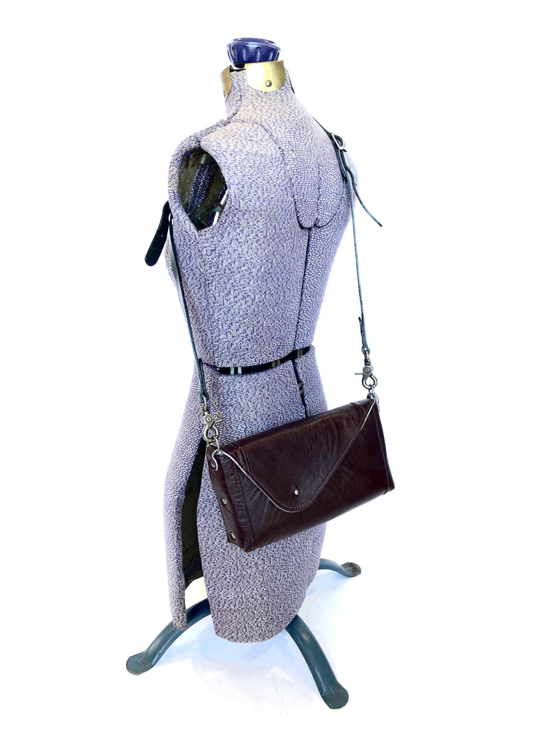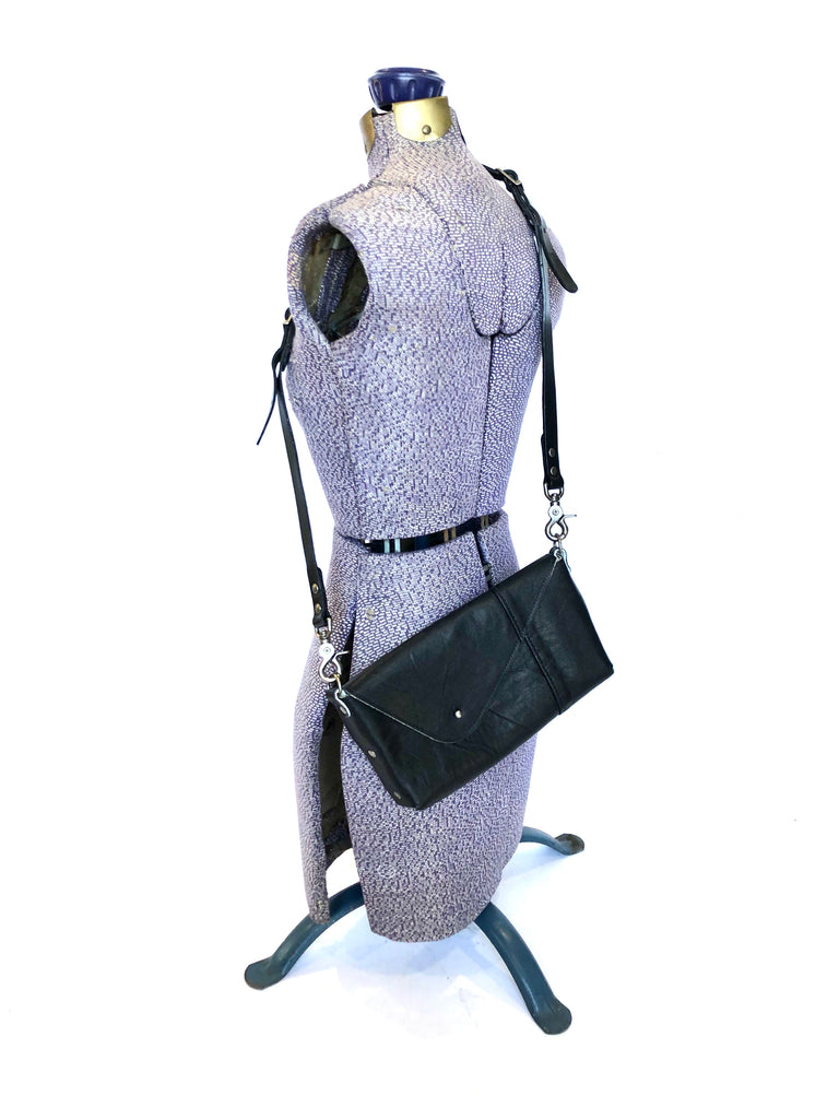 Our asymmetrical clutch made from vintage leather jackets. lined, detachable crossbody strap