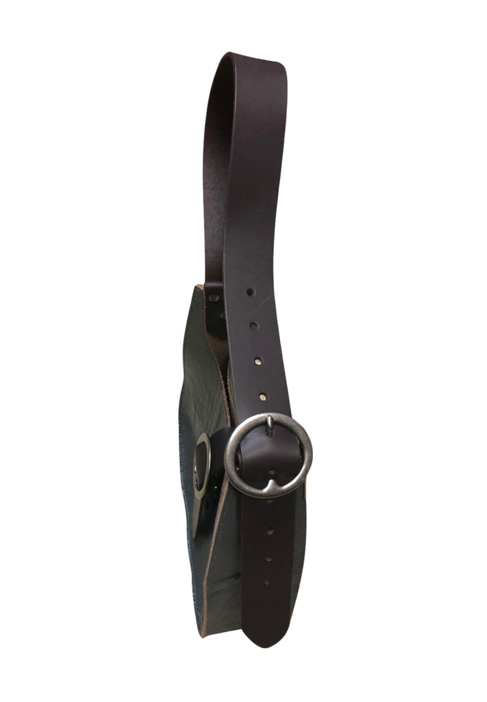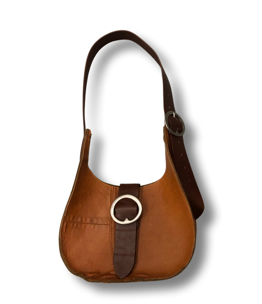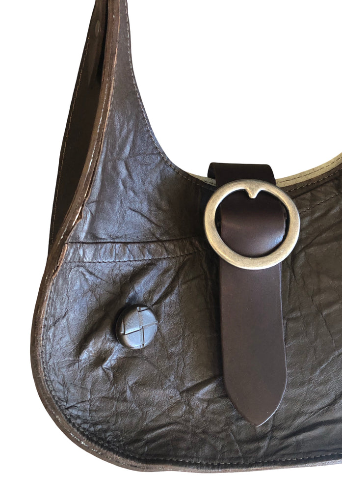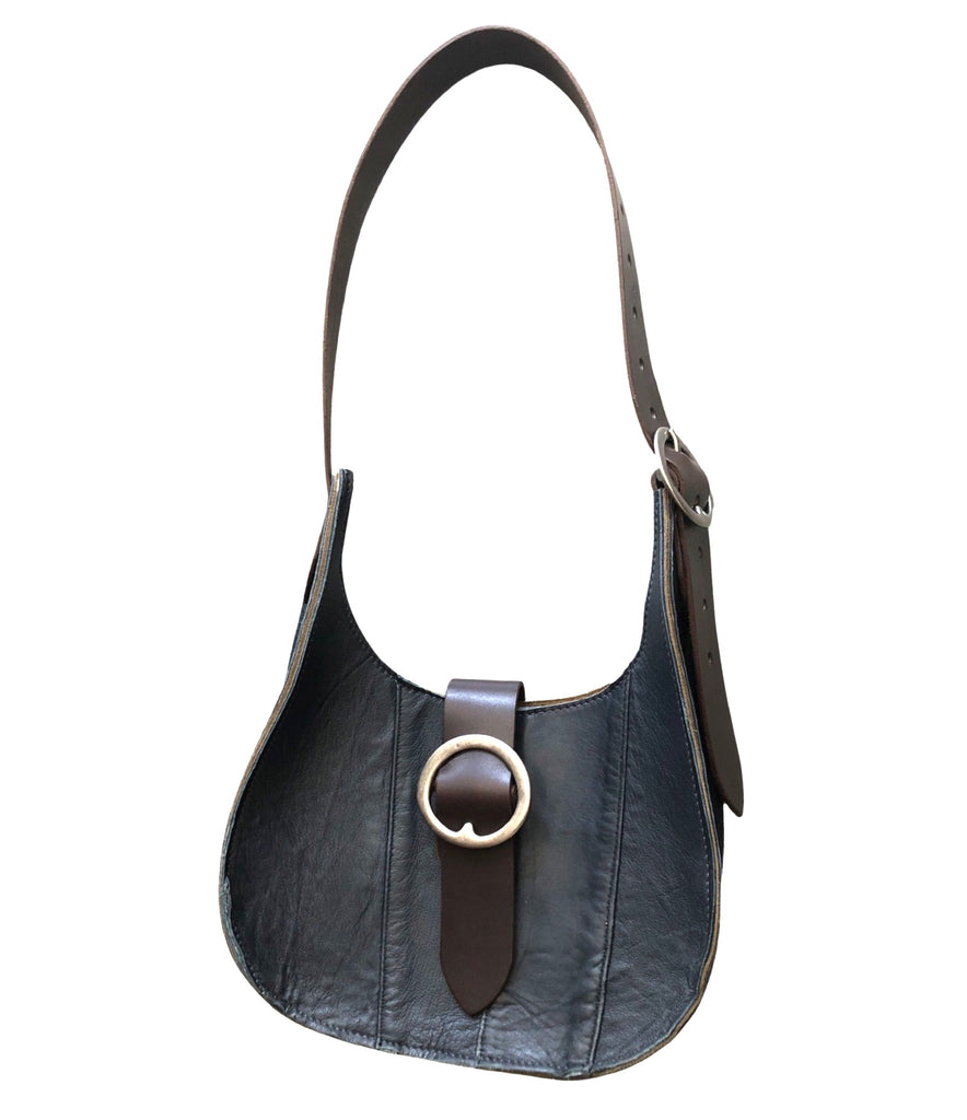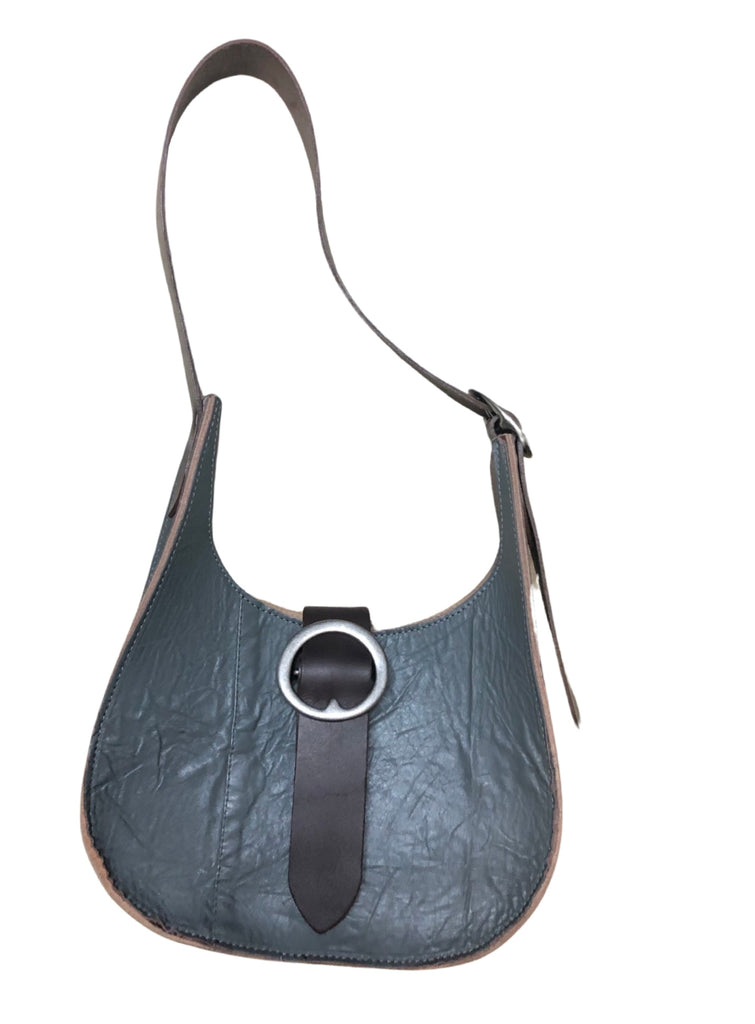Medium teardrop shoulder bag with adjustable belt strap and magnetic closure.Two pewter plated brass buckles. The strap is 1 1/2 wide, 28” long and has plenty adjustment.