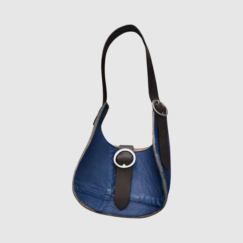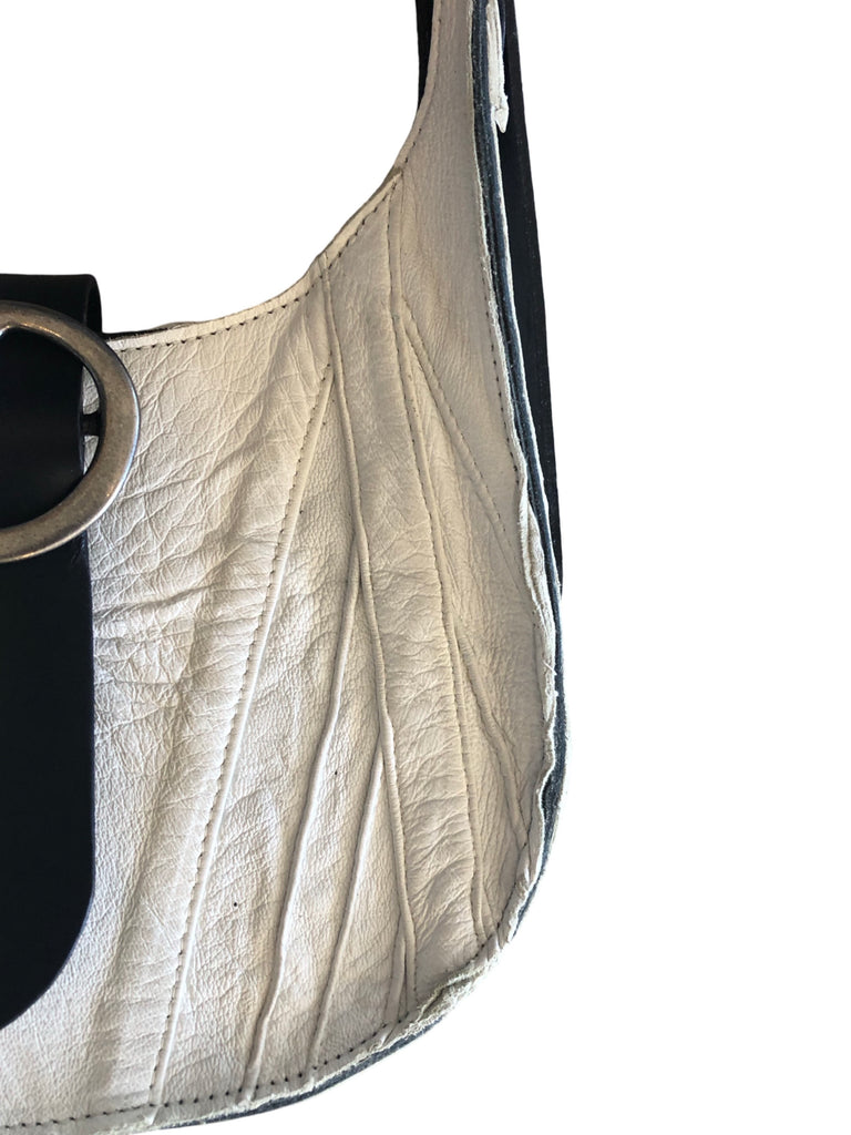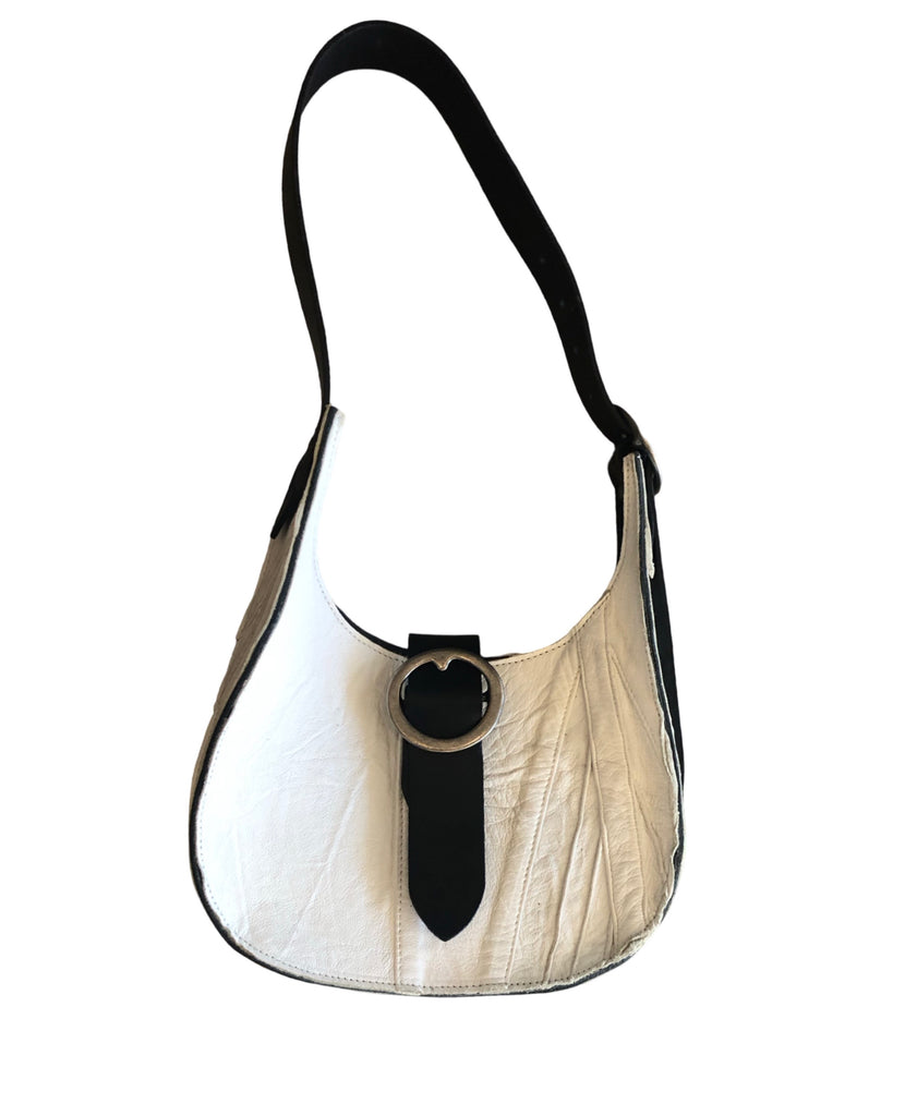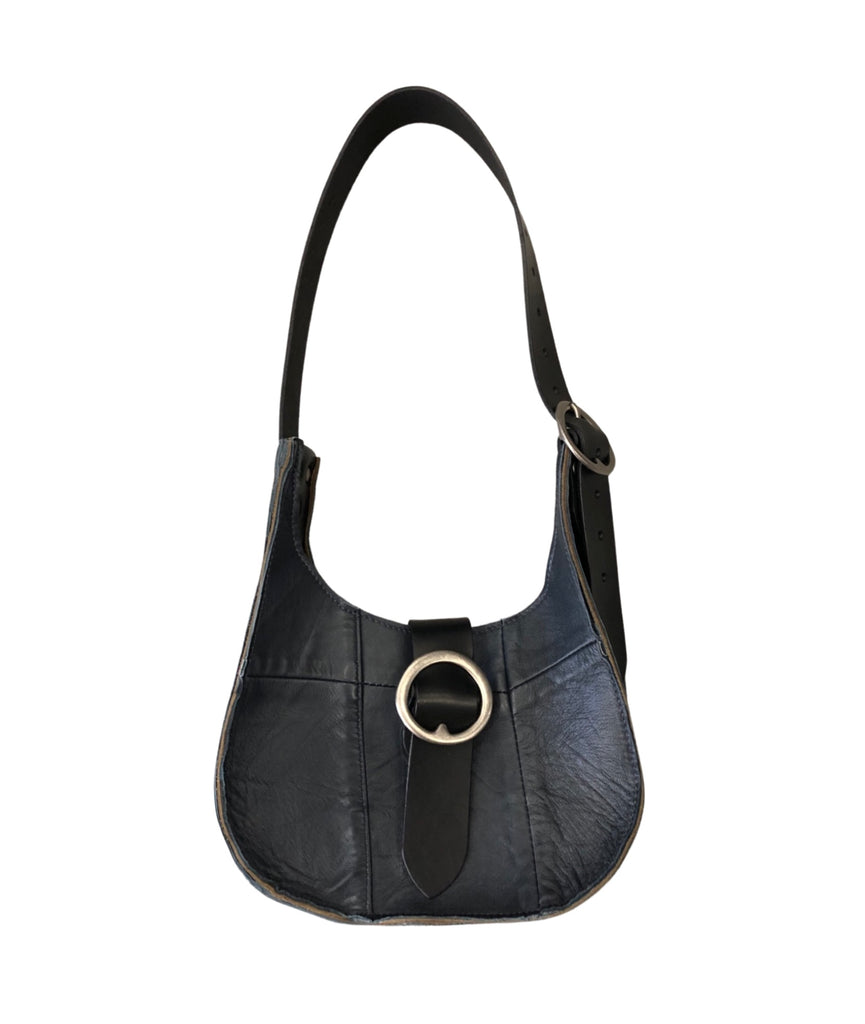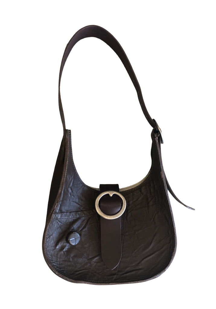 Medium teardrop shoulder bag with adjustable belt strap and magnetic closure.Two pewter plated brass buckles. The strap is 1 1/2 wide, 28” long and has plenty adjustment.