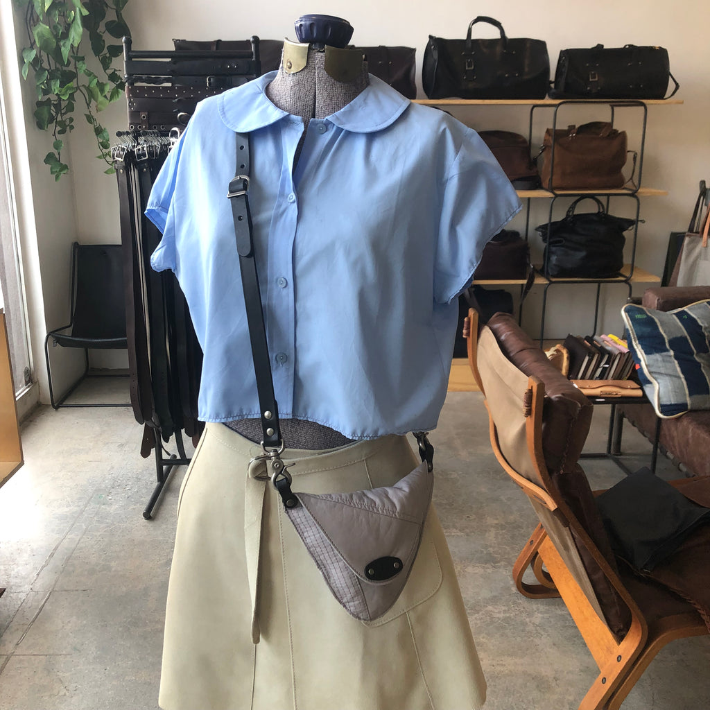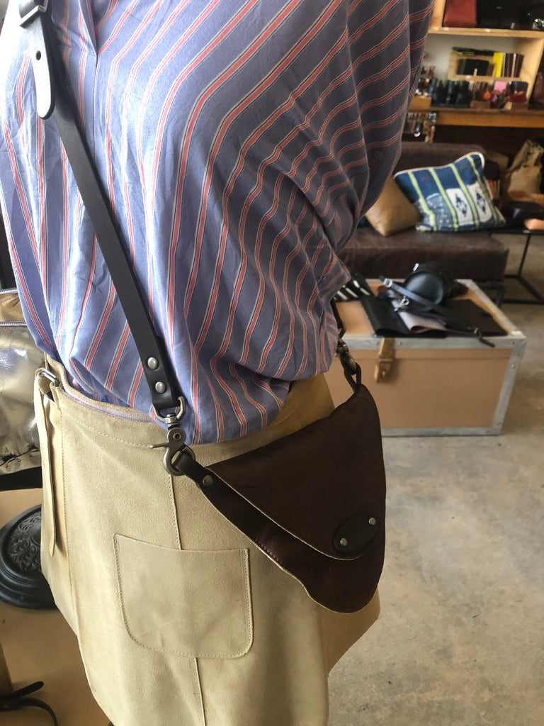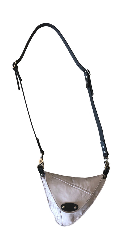 A 'trianglar' pouch ( 6x9") with a magnetic snap. Pouch is worn with an adjustable crossbody strap. ♻️ made from vintage leather jackets