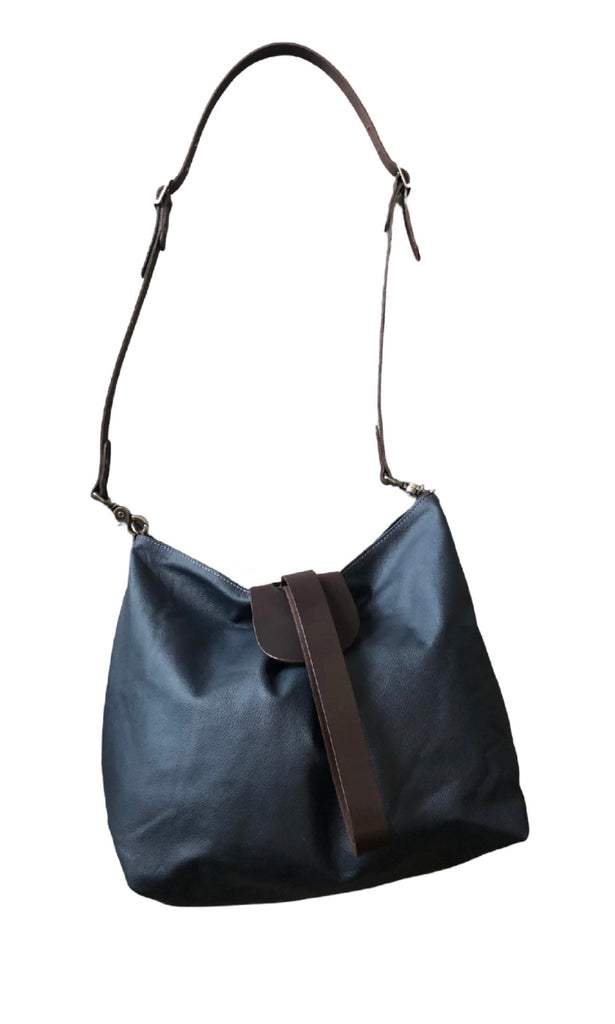 This is a medium clutch/crossbody bag. As a clutch it cinches up with a large loop that serves as a handle and closure. Also comes with a crossbody strap.