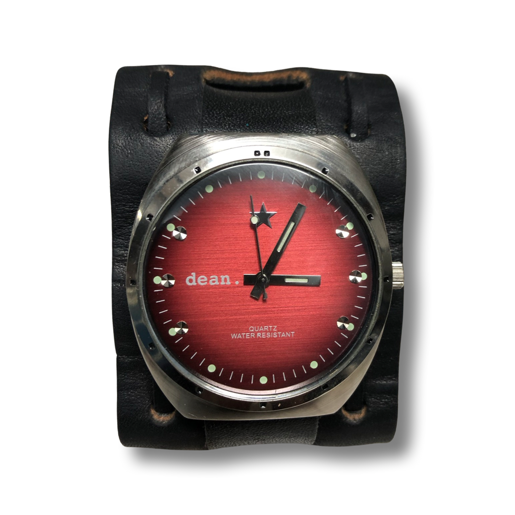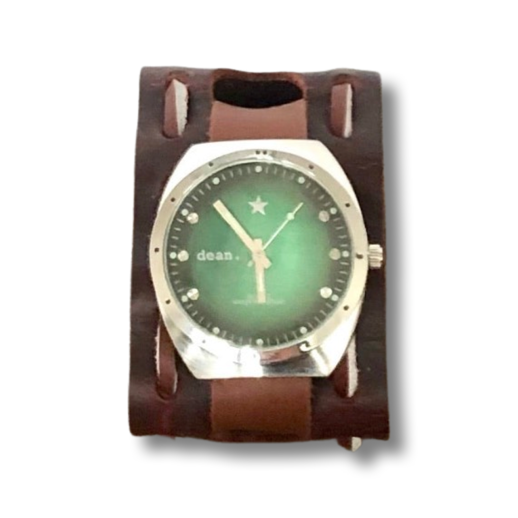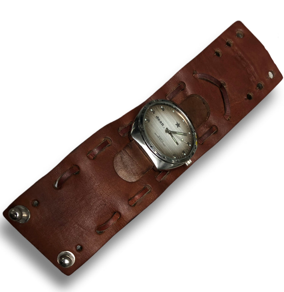 Whipstitched leather band with an oiled finish & steel button closure 2” wide x 7-8.5 (adjustable)