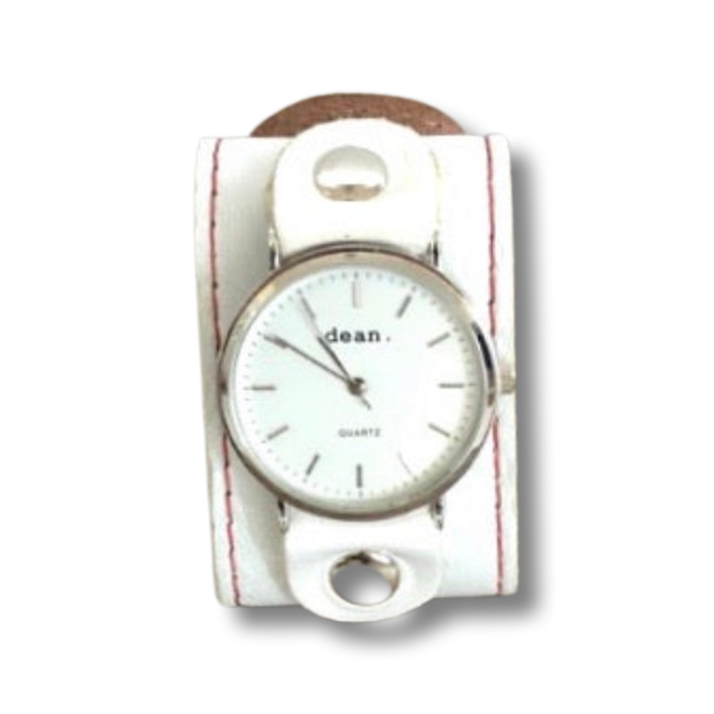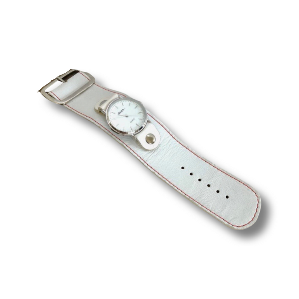 A vintage inspired 70s style watch band in white with a red contrast stitch. 1 1/2” wide 8” long A round 1 3/8” quartz watch face