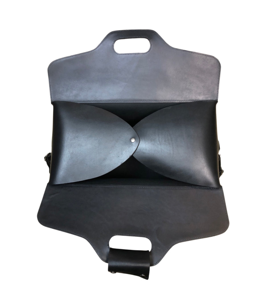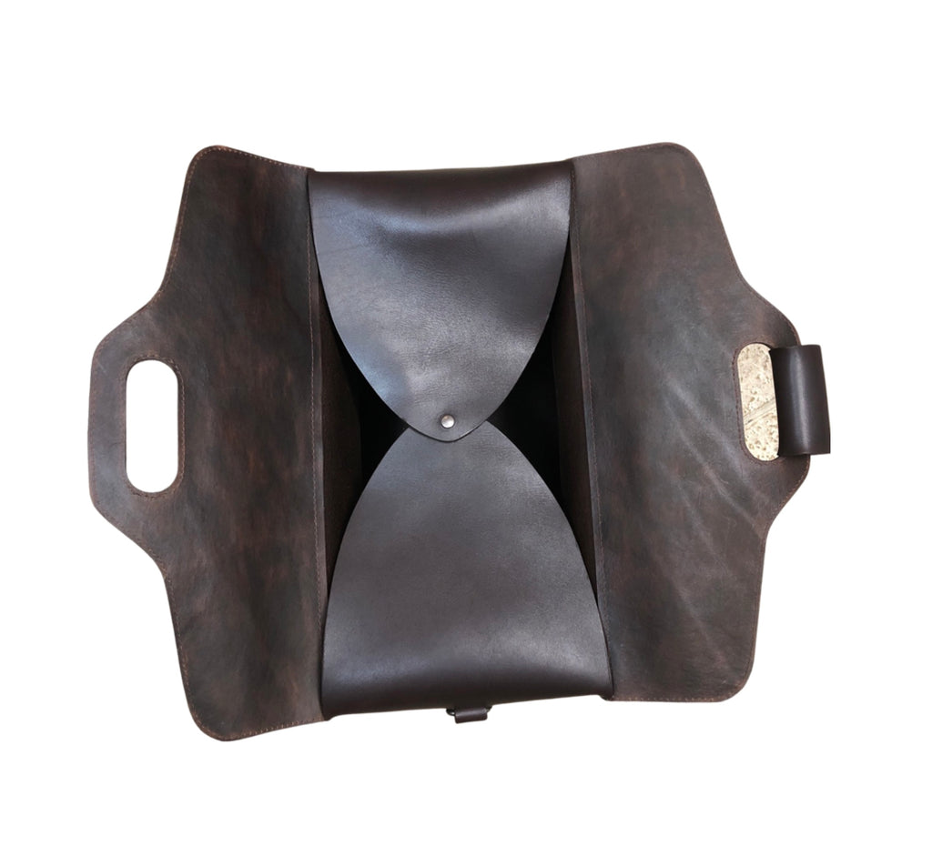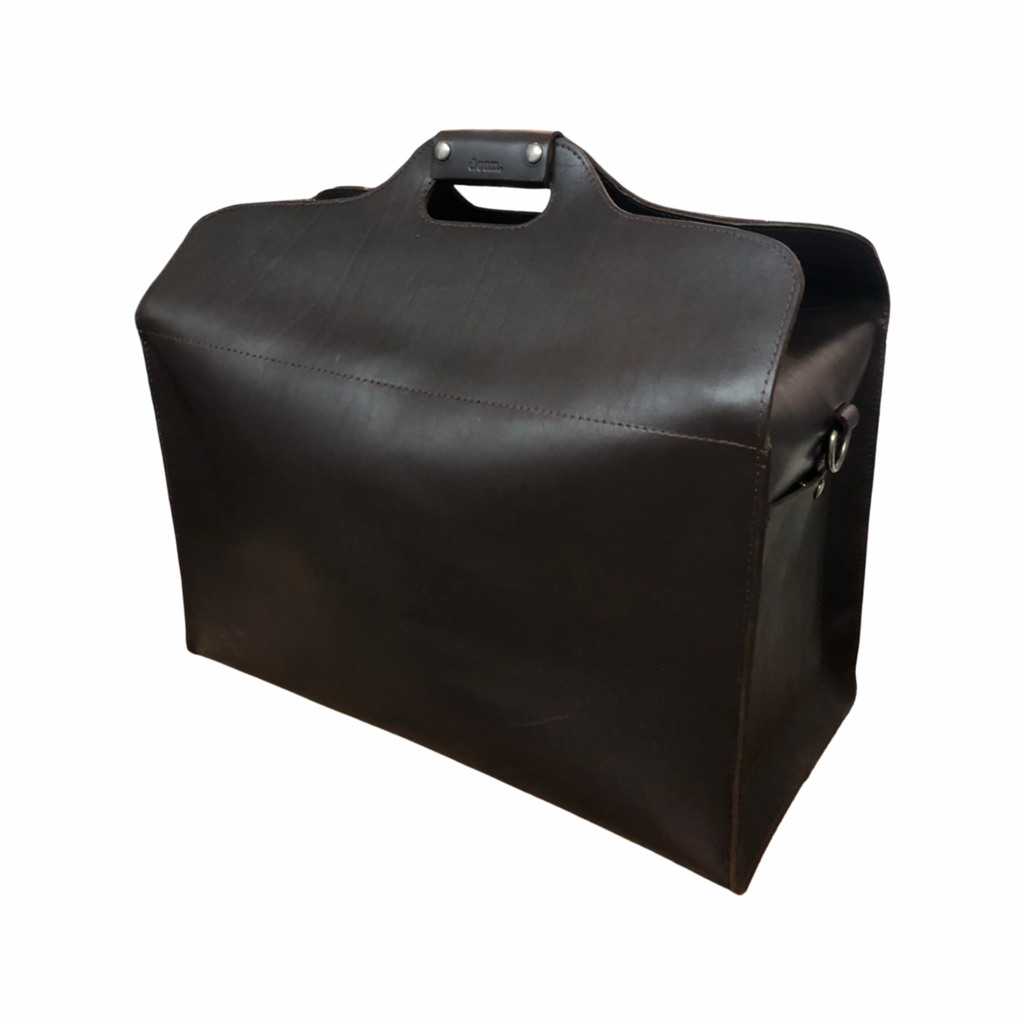 A spacious and refined travel case with two security flaps and snap closure. Two side pockets and a wide ( 2”) shoulder strap. Made with a rugged latigo leather, black or brown.