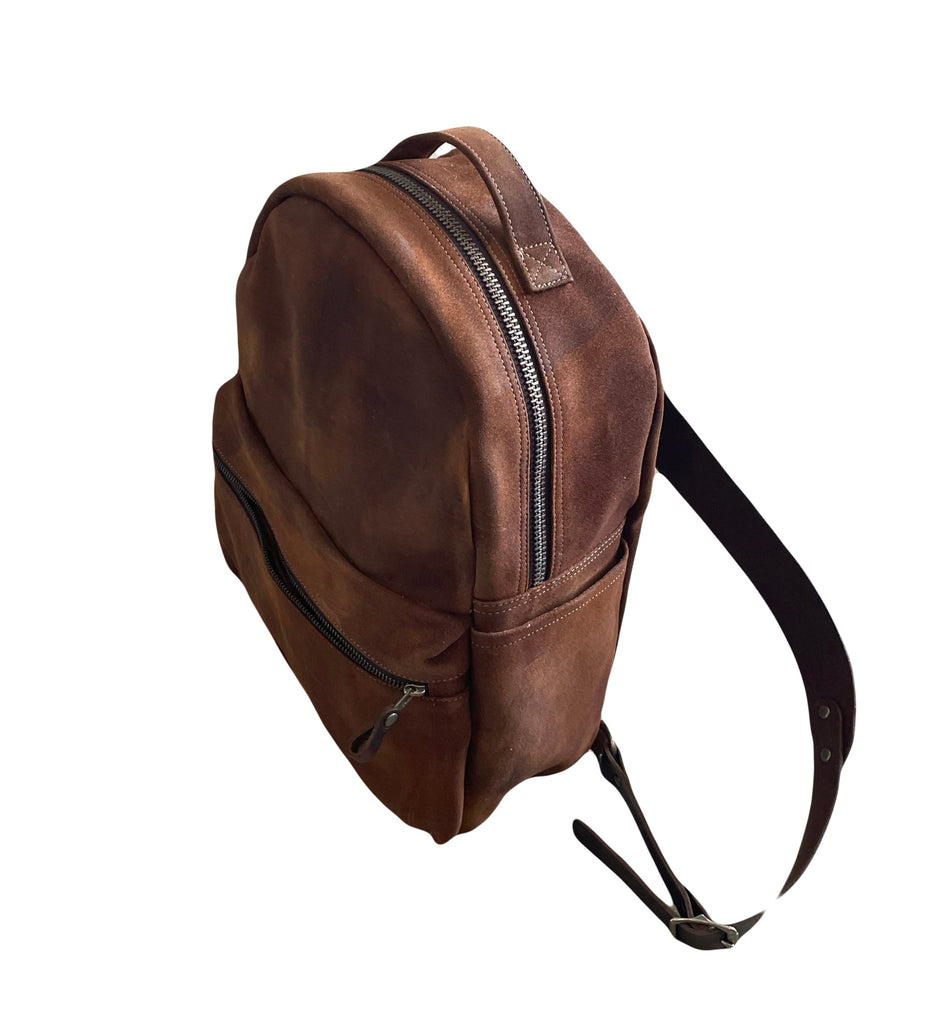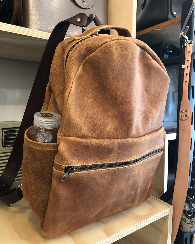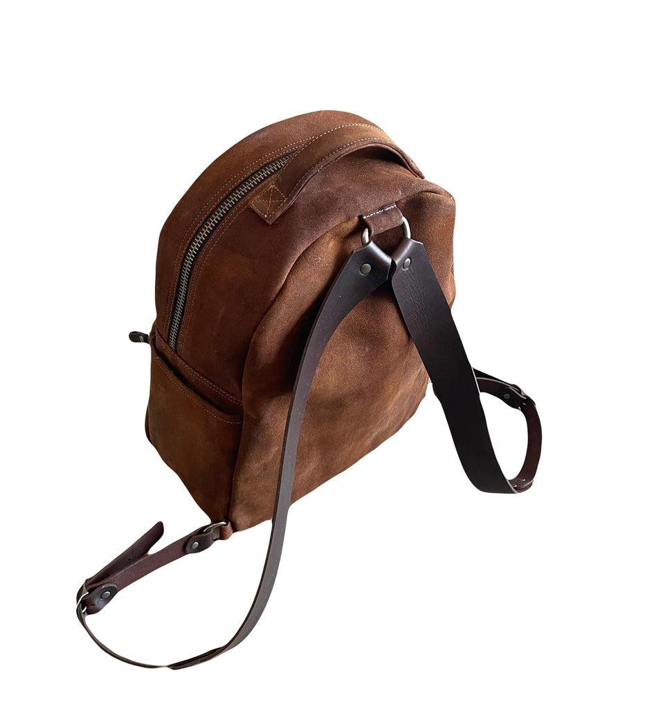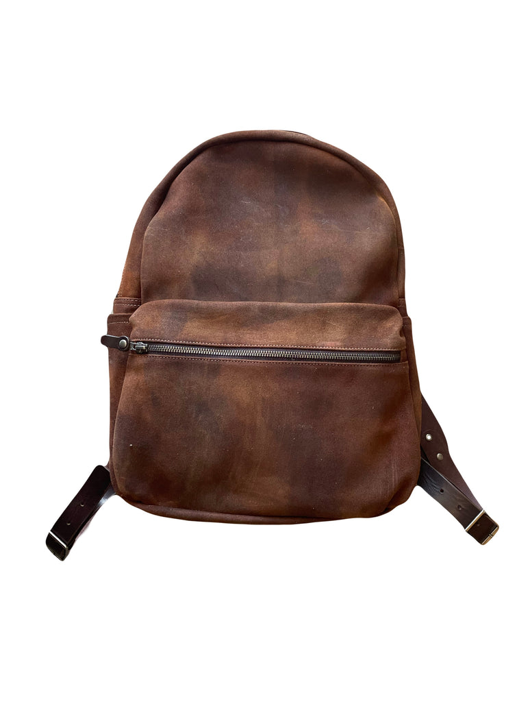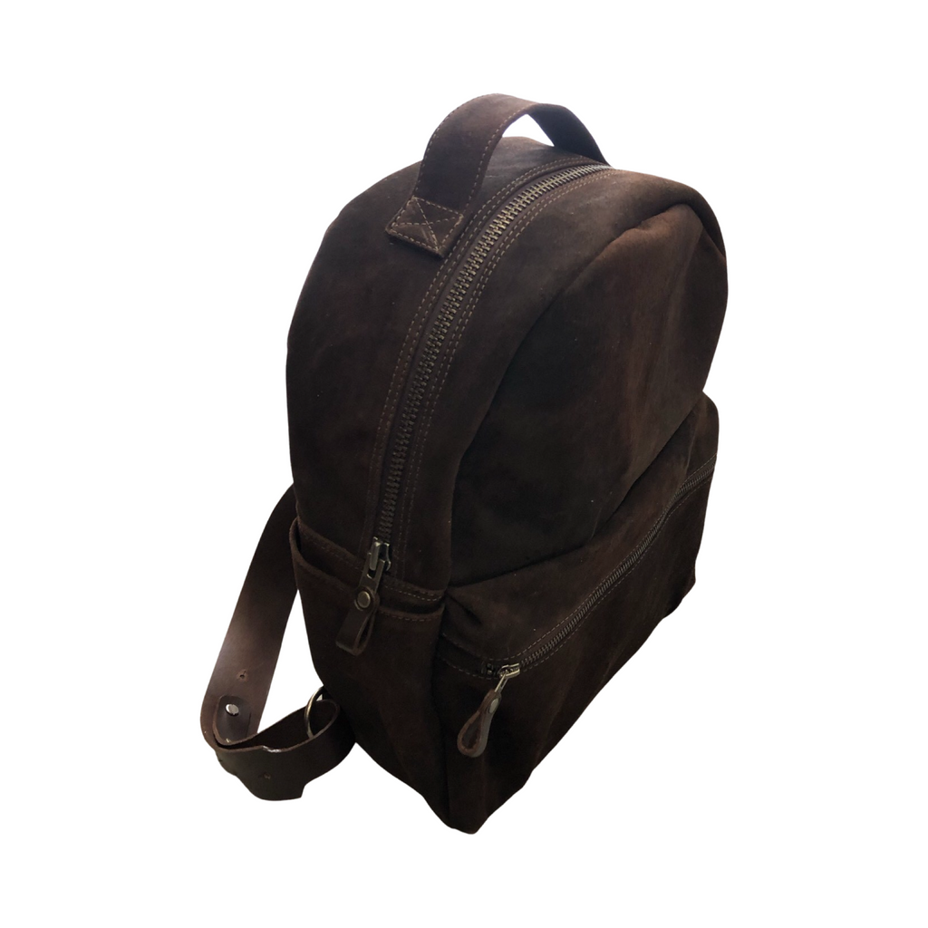 Our take on the traditional backpack. Made with Resolene treated chap suede. Making the suede a bit more rugged and weather resistant. Large front zippered pocket with a small interior pocket, heavy top handle , pen slots and two water bottle side pockets. Heavy duty zippers and wide latigo leather straps with buckles. The finish is bespoke and may vary from bag to bag. It is meant to both protect the suede as well as give it a rugged character