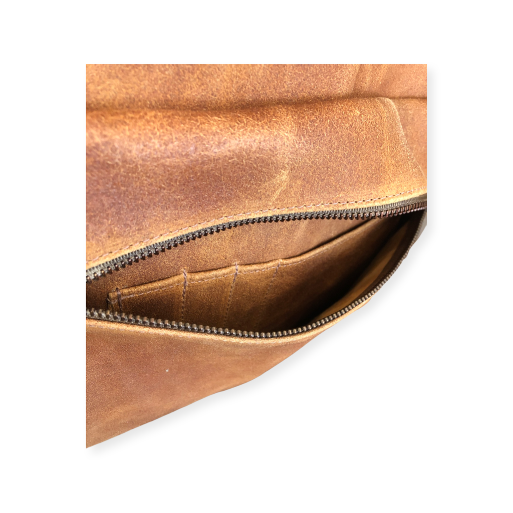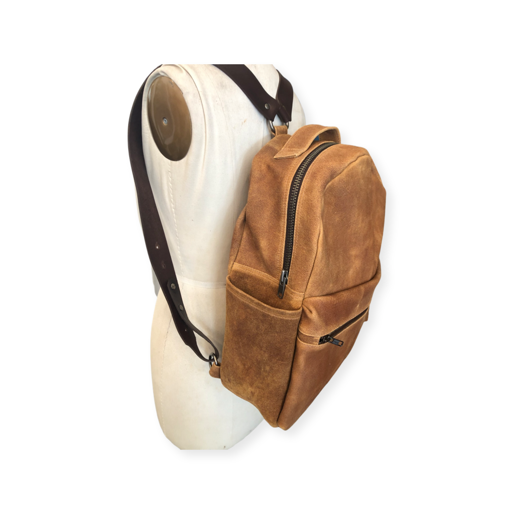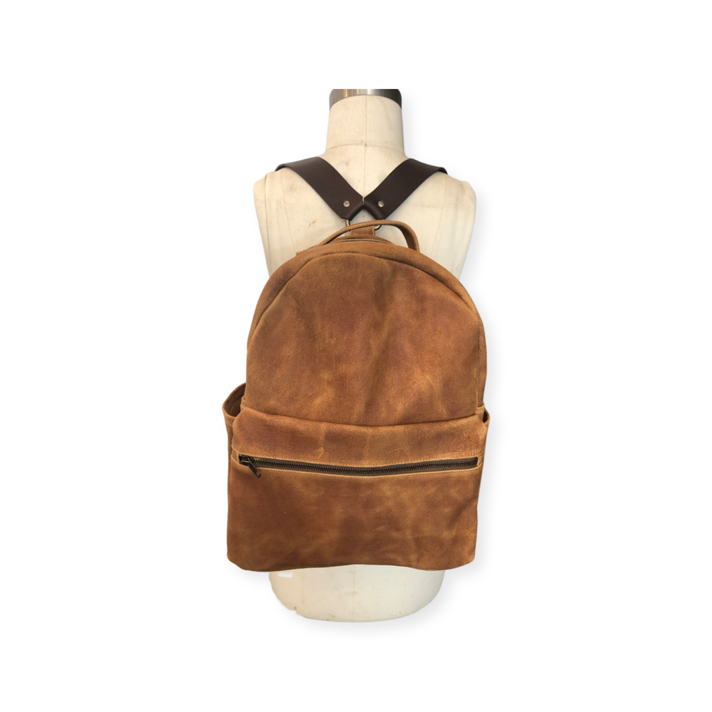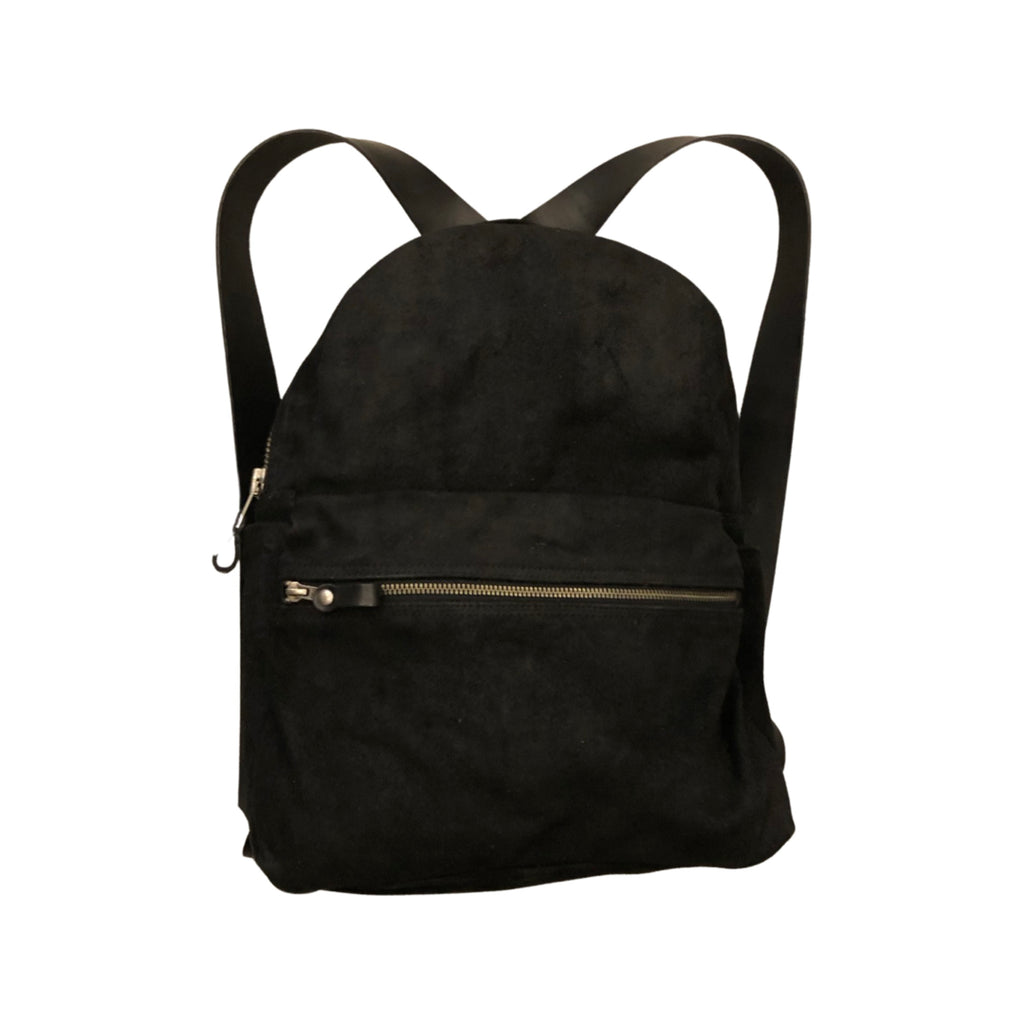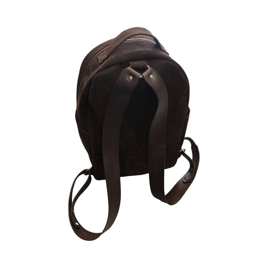 Our take on the traditional backpack. Made with Resolene treated chap suede. Making the suede a bit more rugged and weather resistant. Large front zippered pocket with a small interior pocket, heavy top handle , pen slots and two water bottle side pockets. Heavy duty zippers and wide latigo leather straps with buckles. The finish is bespoke and may vary from bag to bag. It is meant to both protect the suede as well as give it a rugged character