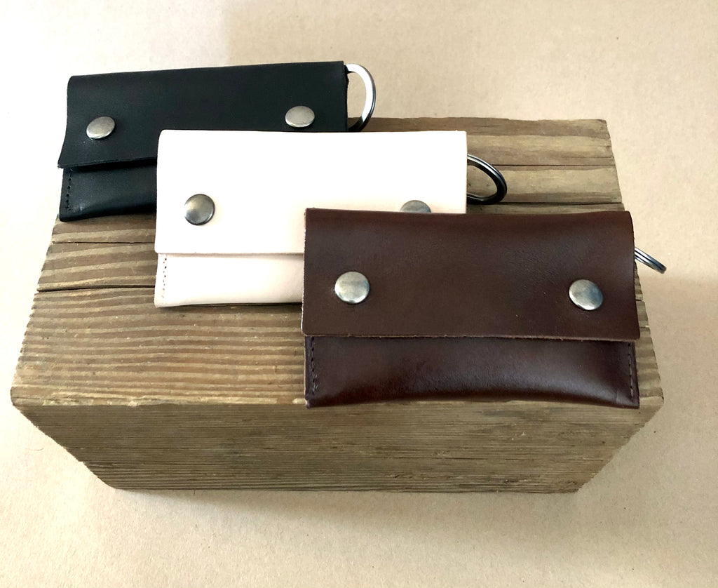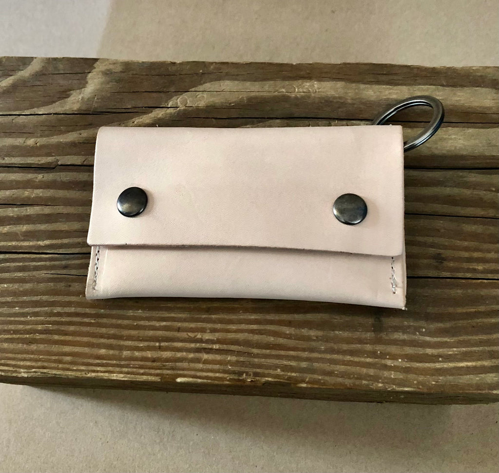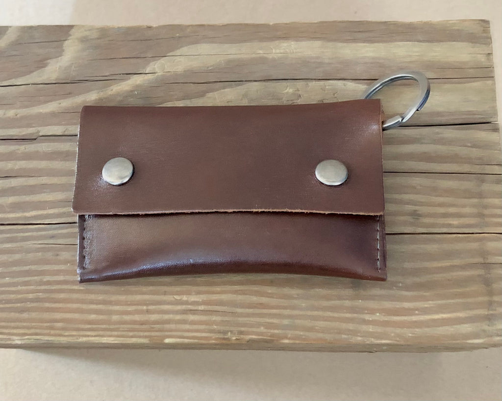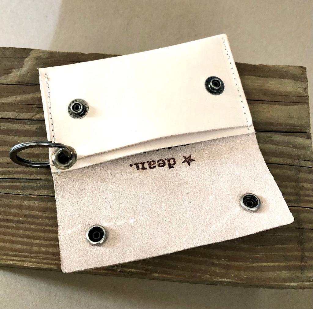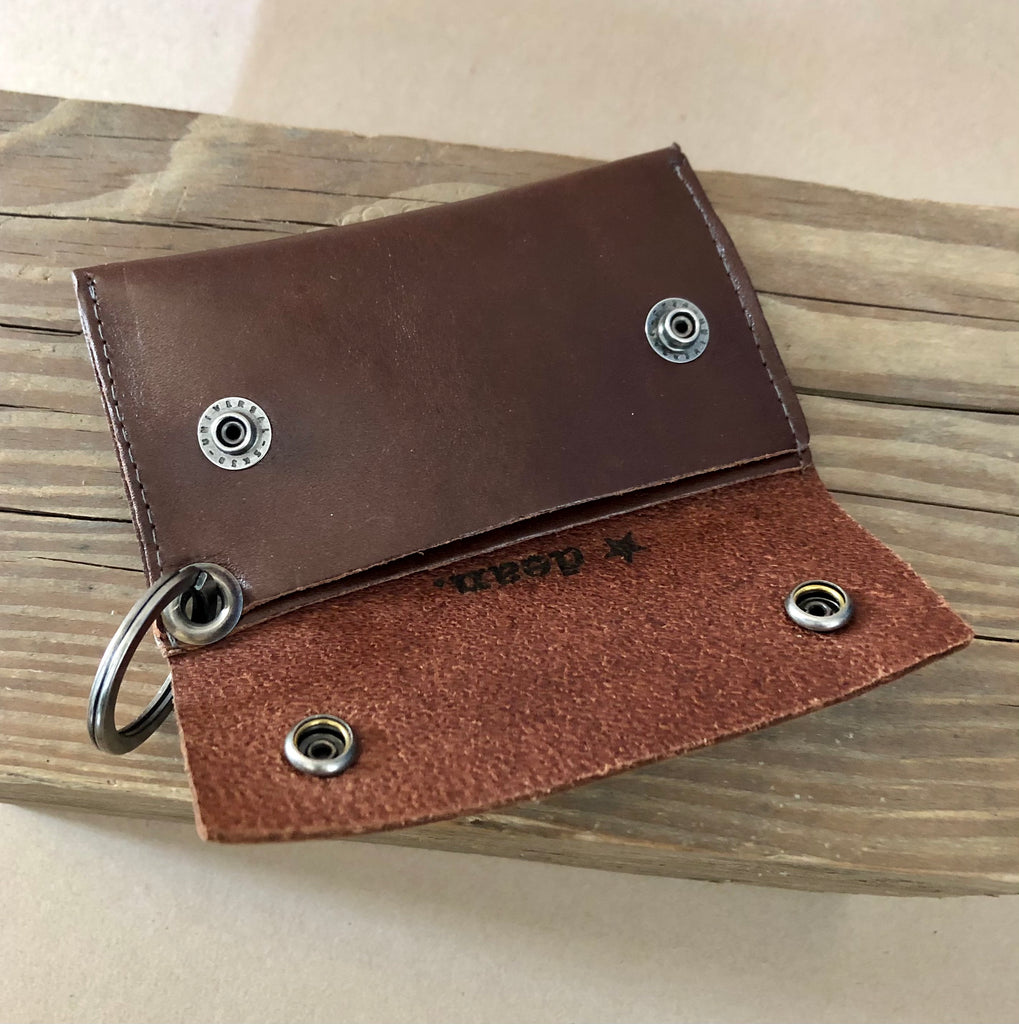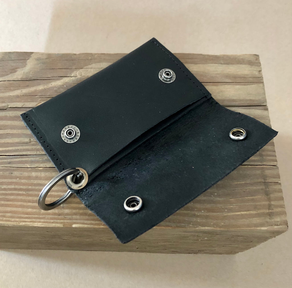 A mini trucker wallet w/ attached key ring. One dividing pocket, two snaps.