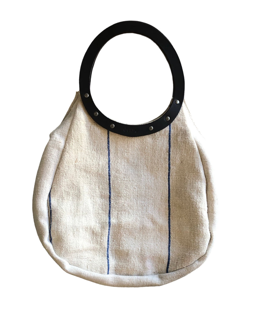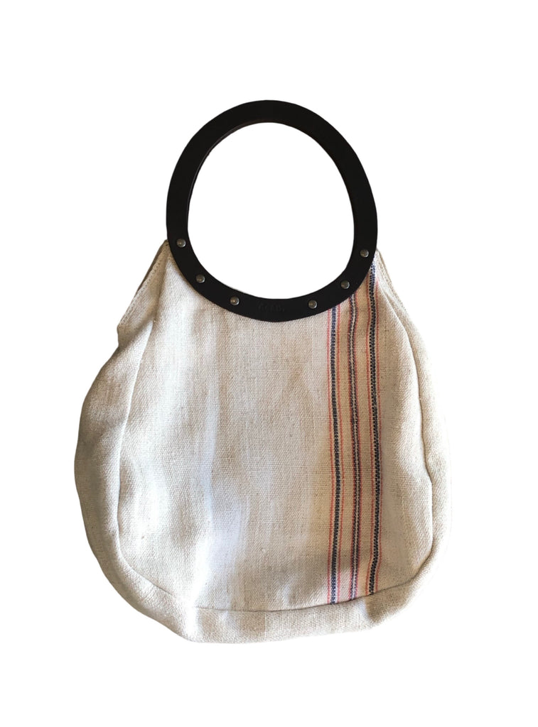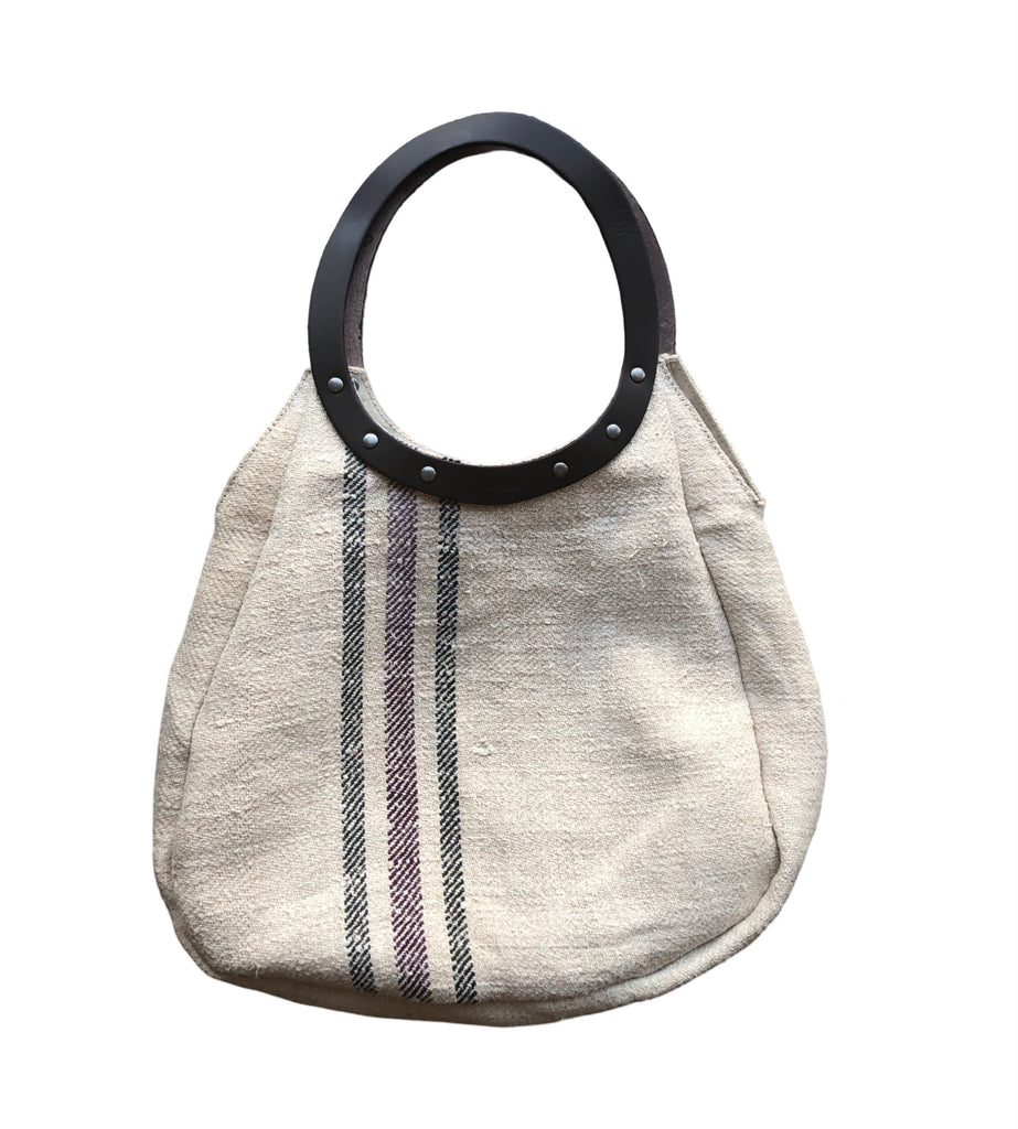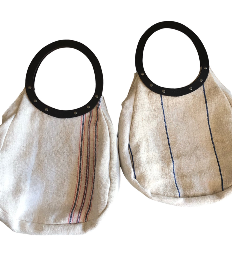 Our classic teardrop in in vintage fabric. We use both African mud cloth & vintage French linen. Lined with beige canvas. Interior pocket, leather handle