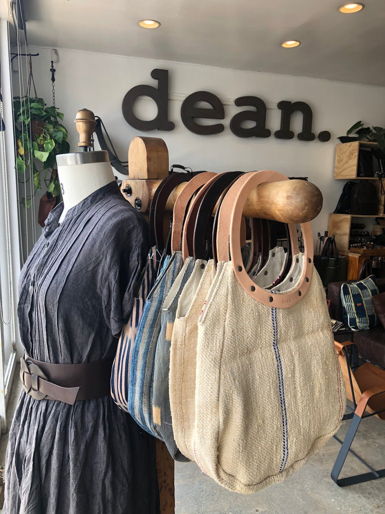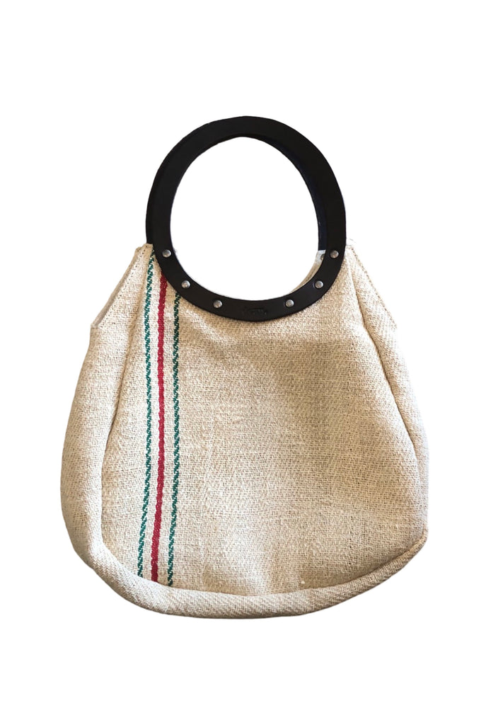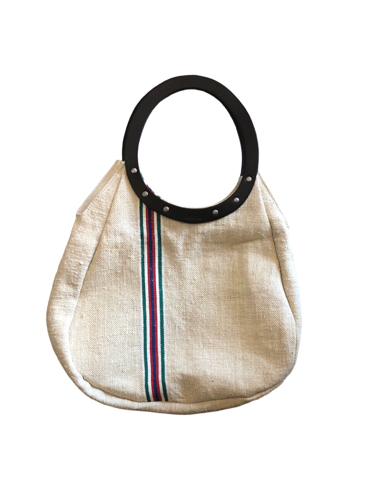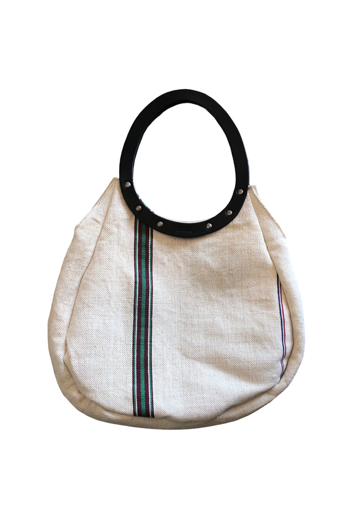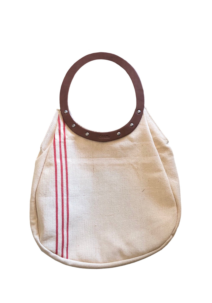 Our classic teardrop in in vintage fabric. We use both African mud cloth & vintage French linen. Lined with beige canvas. Interior pocket, leather handle