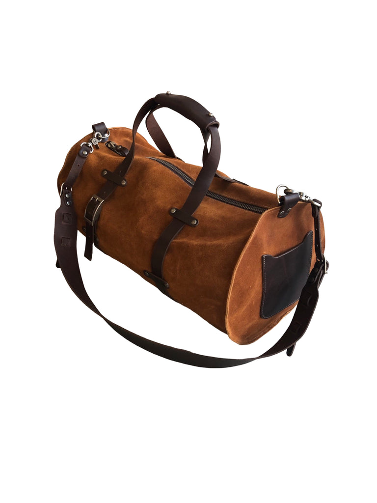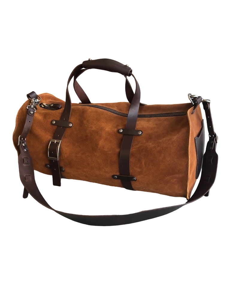 Our best selling duffle bag in Resoline treated suede with latigo trim and straps. Wide adjustable & detachable shoulder strap. Carry on friendly
