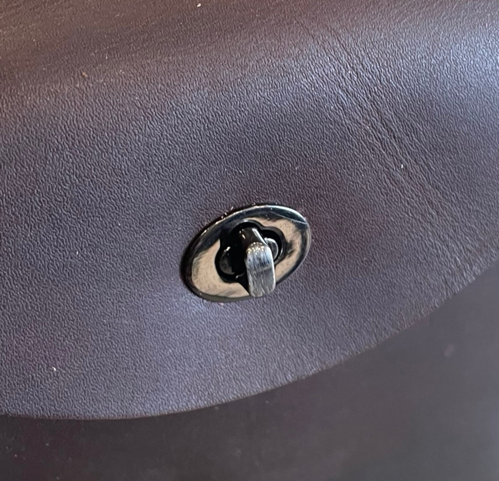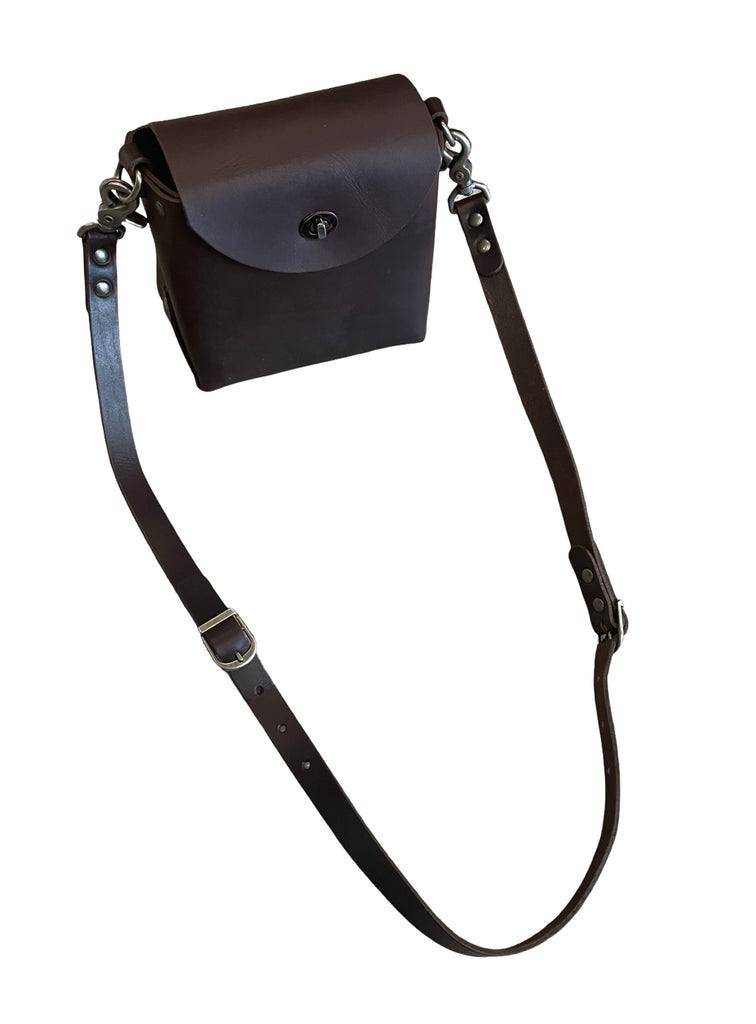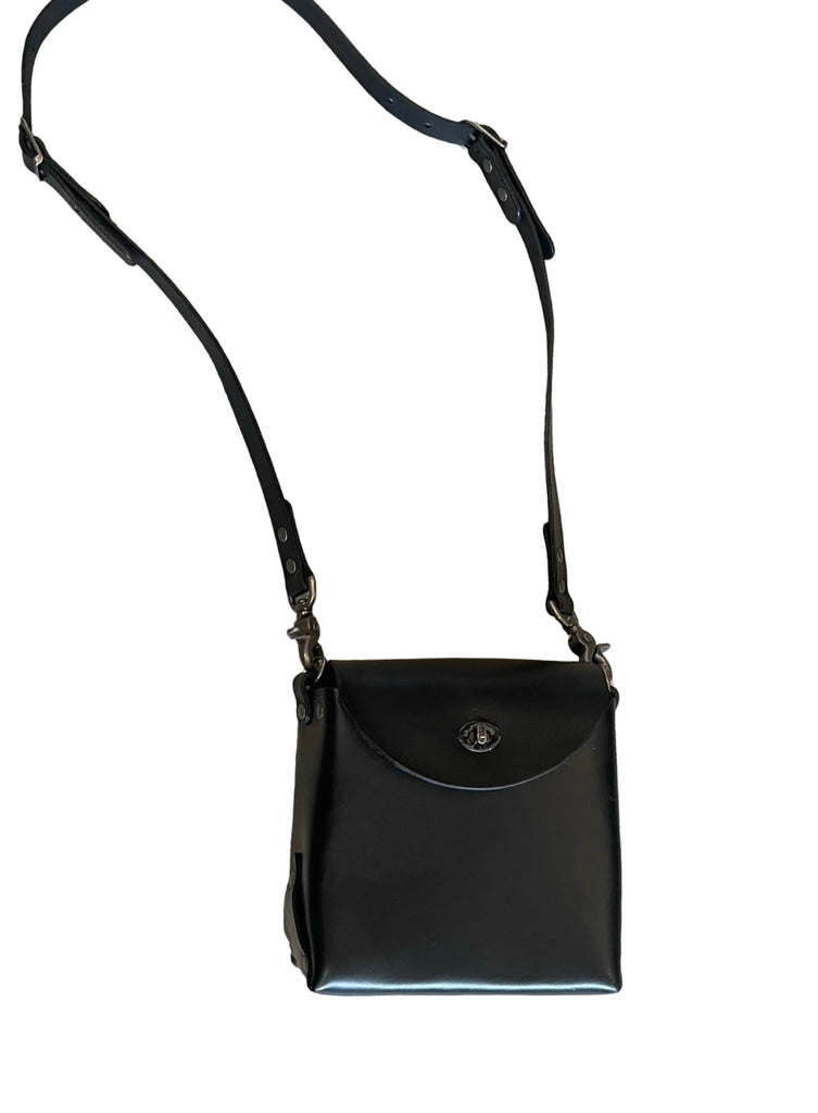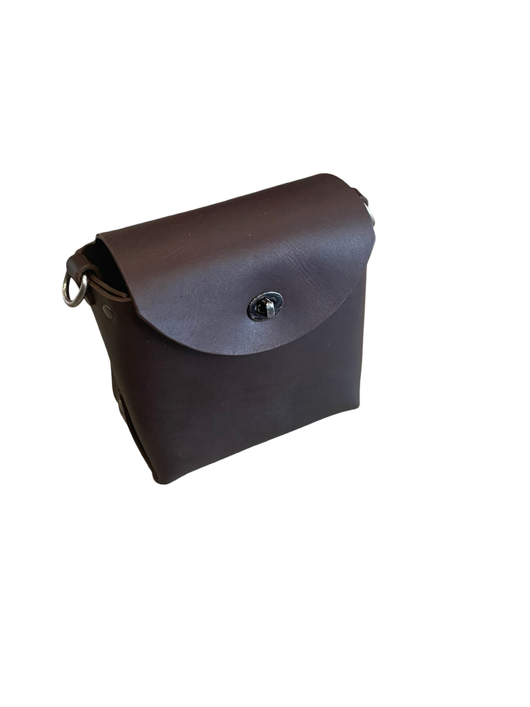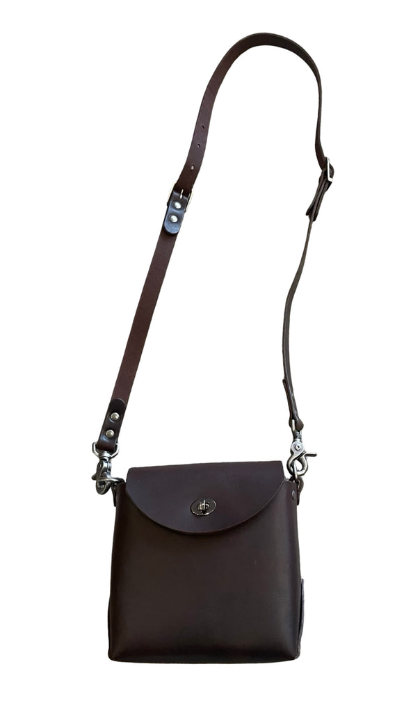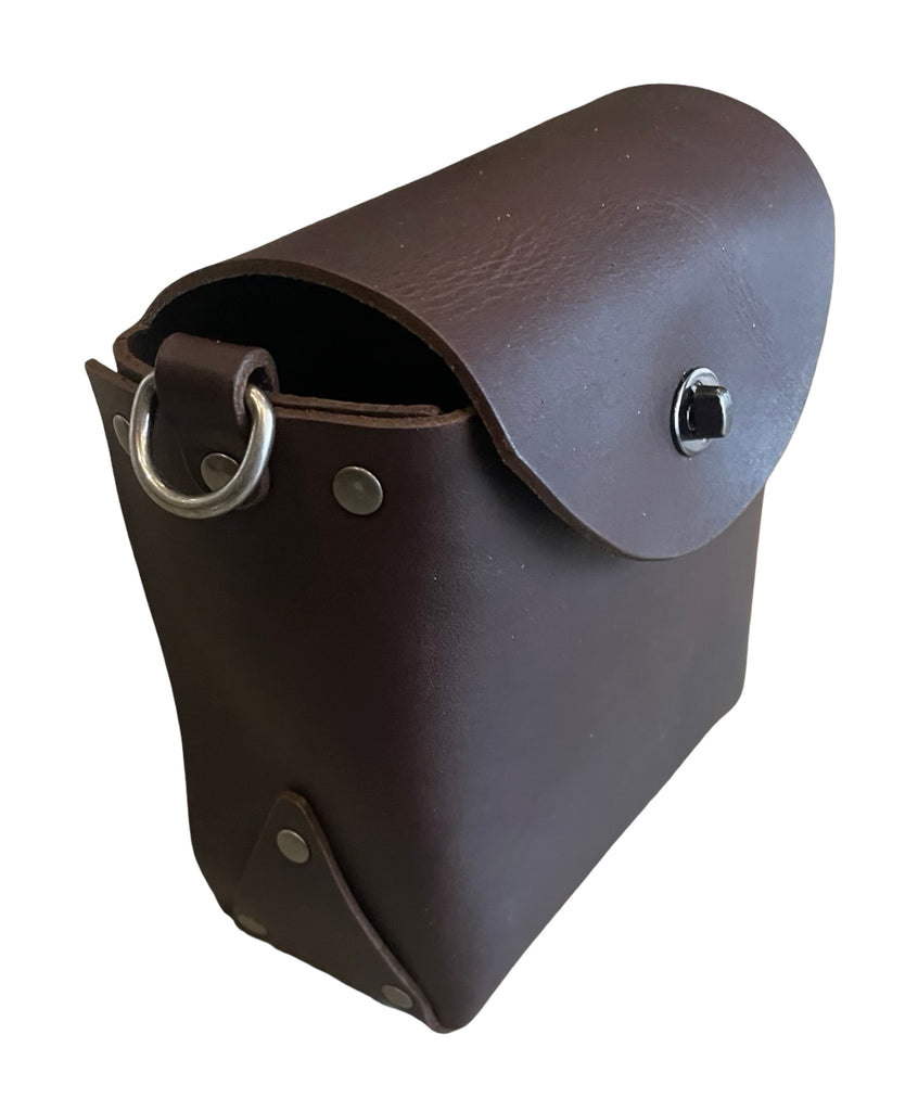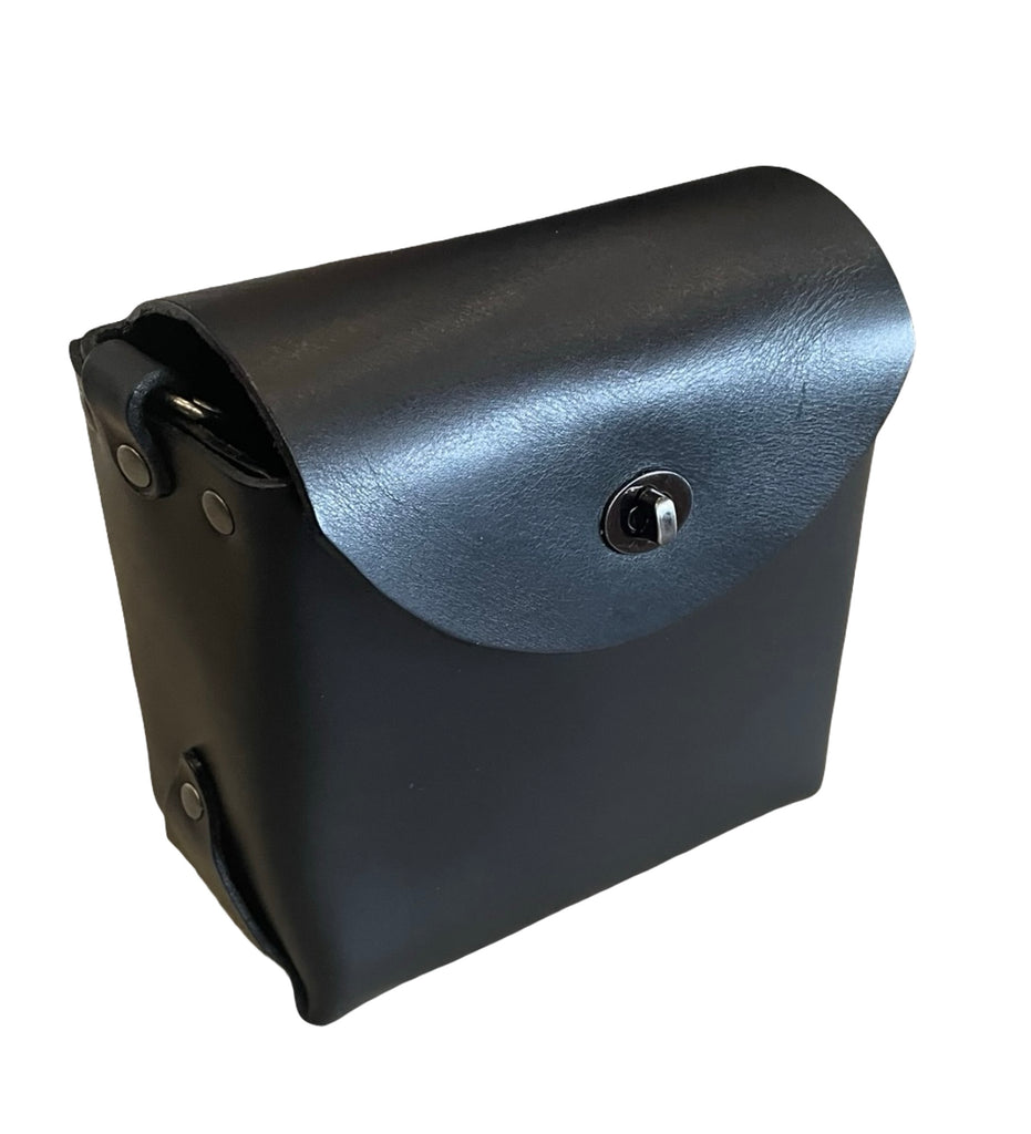 A small square structured case with rivet side details and a twist toggle closure. Detachable shoulder strap